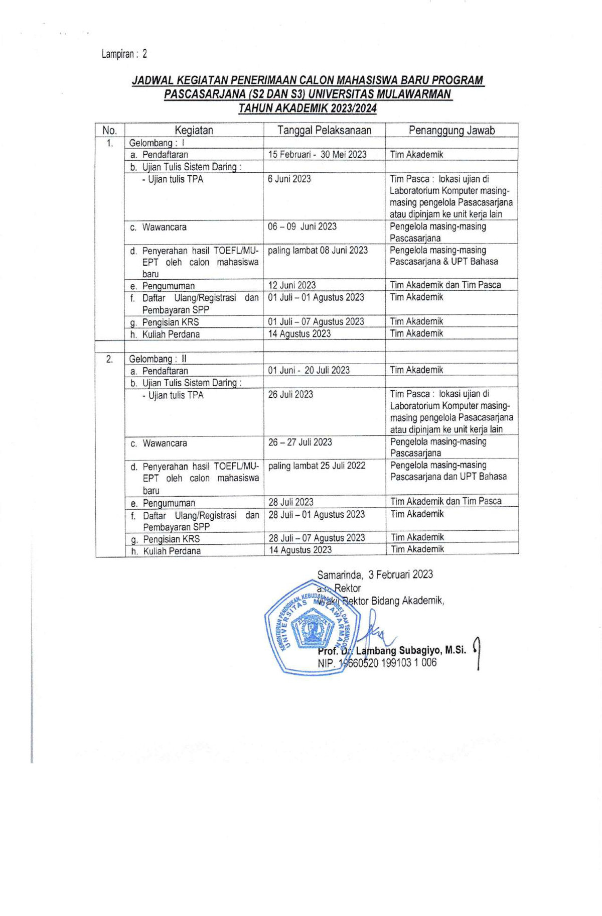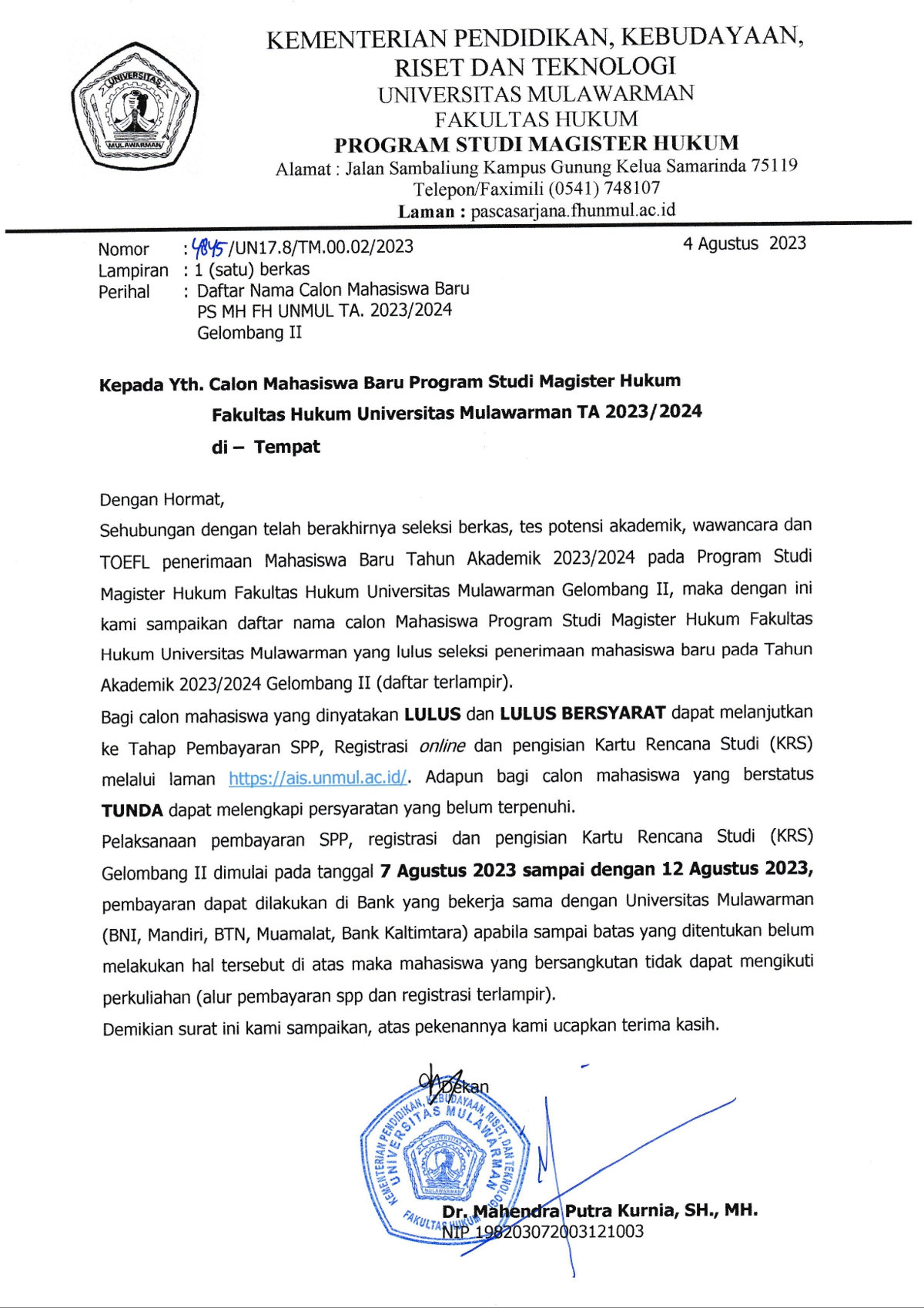 Sehubungan dengan berakhirnya seleksi berkas, tes potensi akademik, wawancara dan TOEFL penerimaan Mahasiswa Baru Tahun Akademik 2023/2024 pada Program Studi Magister Hukum Fakultas Hukum Universitas Mulawarman Gelombang 2, maka dengan ini kami sampaikan daftar nama calon Mahasiswa yang lulus seleksi Tahun Akademik 2023/2024 Gelombang 2.