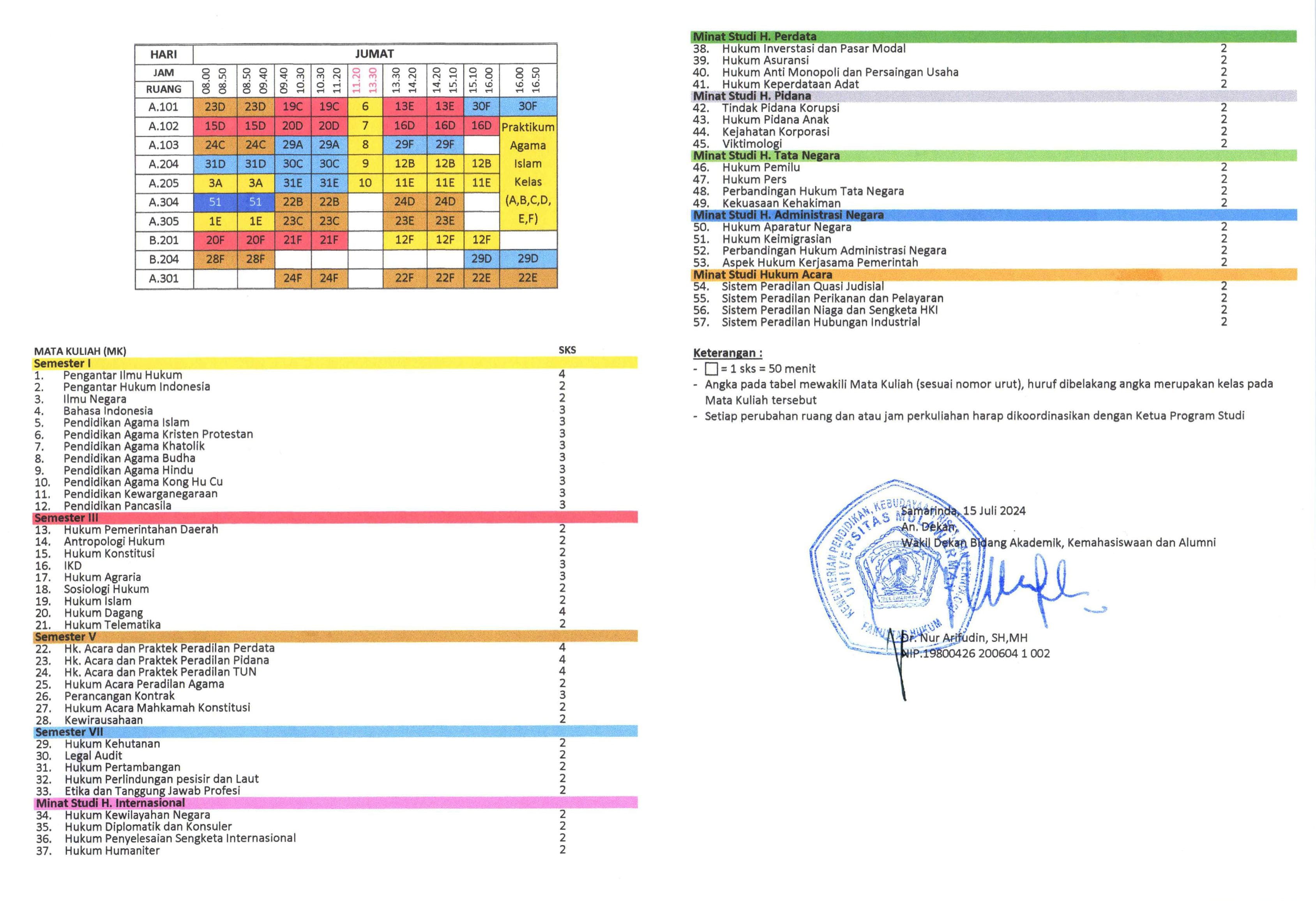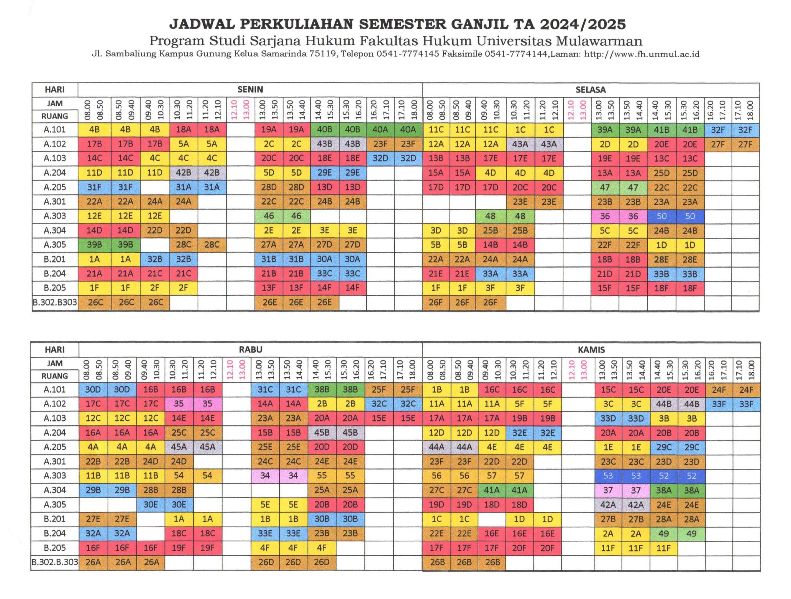 Berikut kami informasikan Jadwal Perkuliahan Semester Ganjil Tahun Akademik 2024/2025 Program Studi Sarjana Hukum Fakultas Hukum Universitas Mulawarman.