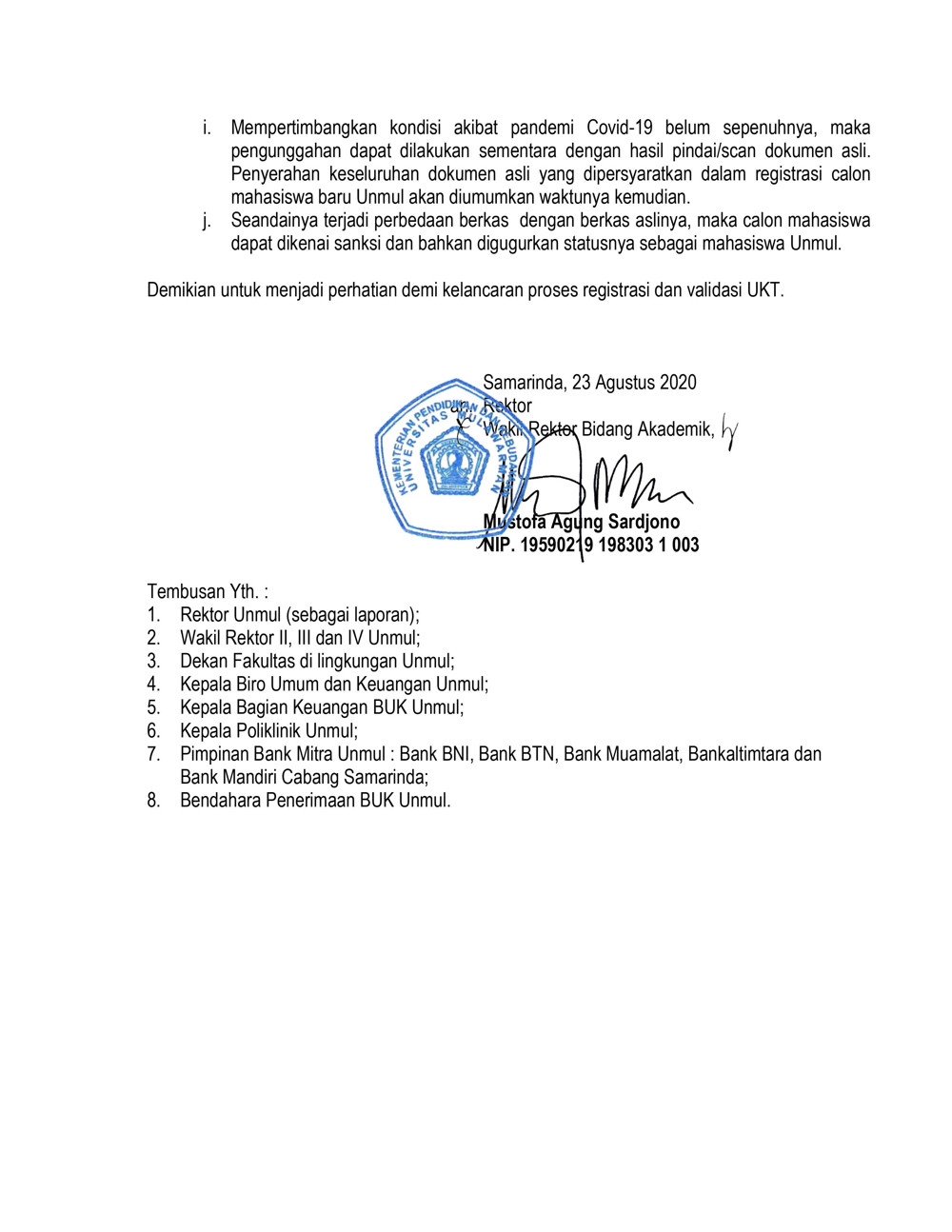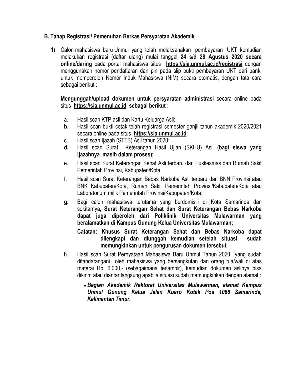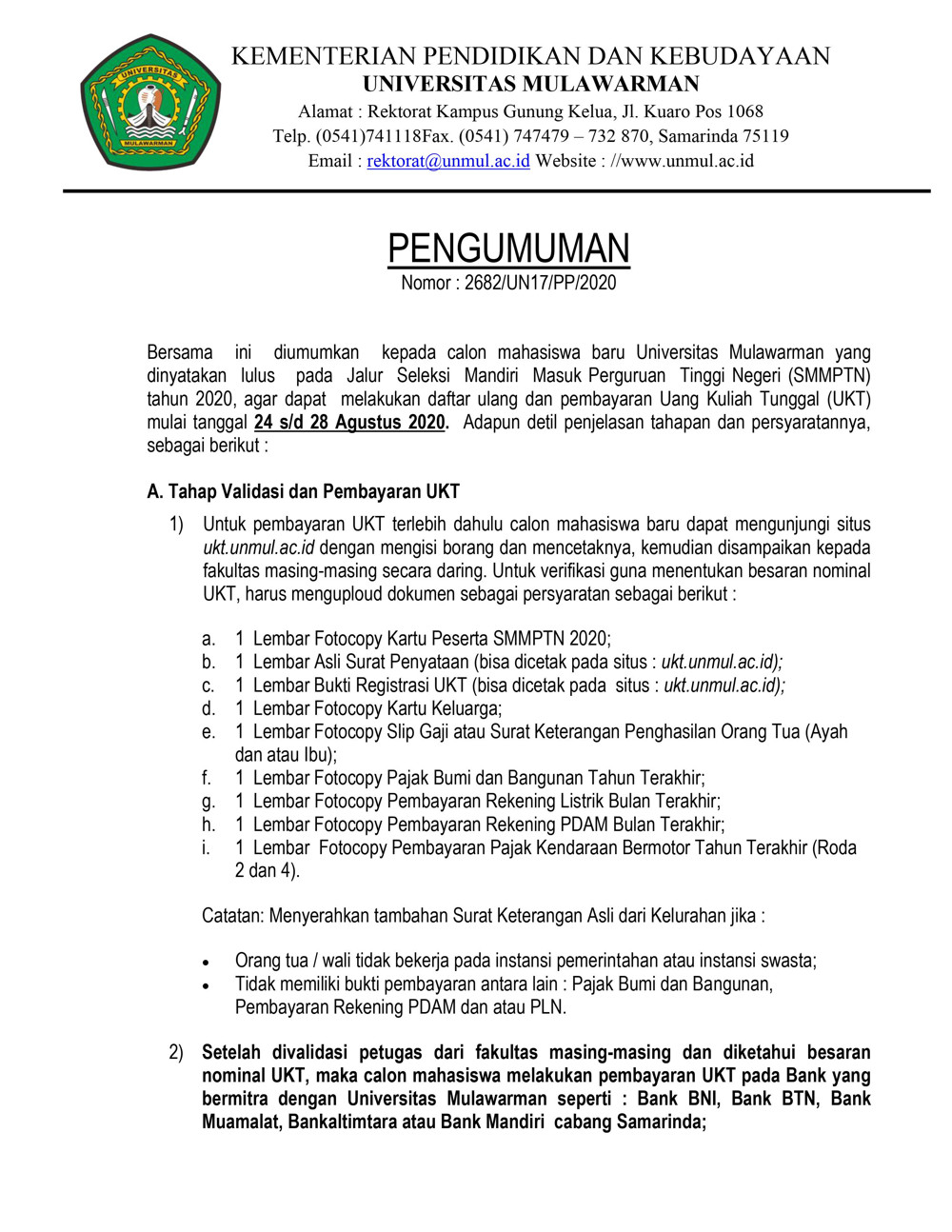 Bersama ini diumumkan kepada calon mahasiswa baru Universitas Mulawarman yang dinyatakan lulus pada Jalur Seleksi Mandiri Masuk Perguruan Tinggi Negeri (SMMPTN) tahun 2020, agar dapat melakukan daftar ulang dan pembayaran Uang Kuliah Tunggal (UKT) mulai tanggal 24 s/d 28 Agustus 2020.