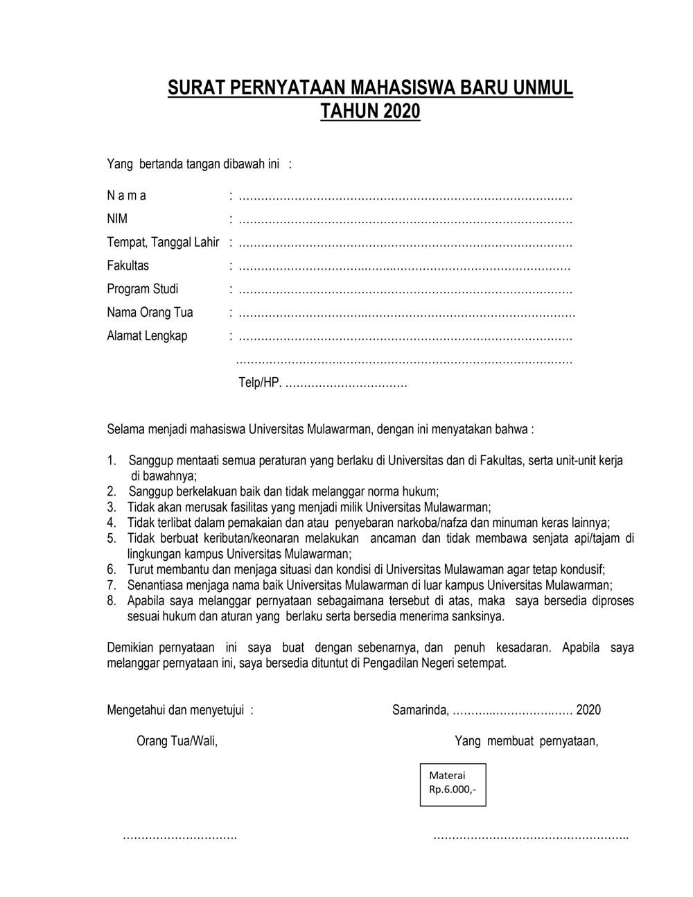 Foto 4: Lampiran - Surat pernyataan Mahasiswa Baru Tahun 2020