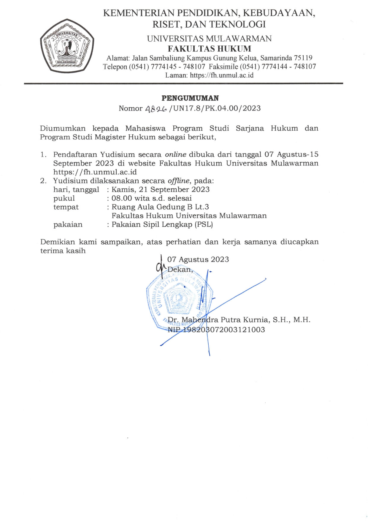 Foto 1: Surat Pengumuman Perihal Pendaftaran Yudisium Gelombang 3 Tahun 2023 Fakultas Hukum UNMUL