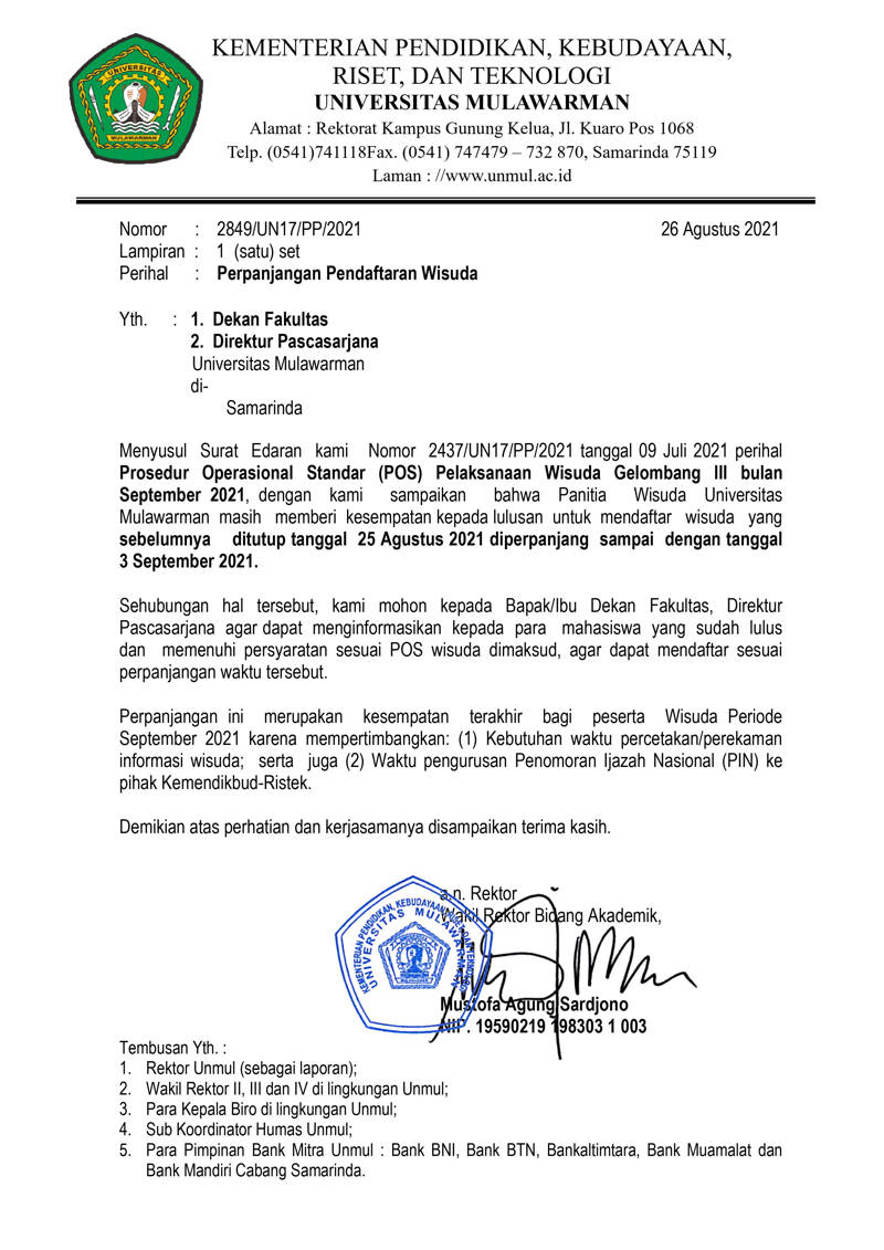 Menyusul Surat Edaran Nomor 243/UN17?PP/2021 tanggal 09 Juli 2021 perihal Prosedur Operasional Standar (POS) Pelaksanaan Wisuda Gelombang III bulan September 2021, dengan ini kami sampaikan bahwa Panitia Wisuda Universitas Mulawarman masih memberi kesempatan kepada lulusan untuk mendaftar wisuda yang sebelumnya ditutup tanggal 25 Agustus 2021 diperpanjang sampai dengan tanggal 3 September 2021.