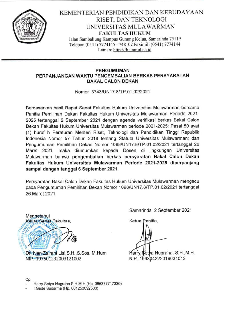Diumumkan kepada Dosen dilingkungan Universitas Mulawarman, bahwa pengembalian berkas persyaratan Bakal Calon Dekan Fakultas Hukum Universitas Mulawarman Periode 2021-2025 diperpanjang sampai dengan tanggal 6 September 2021.