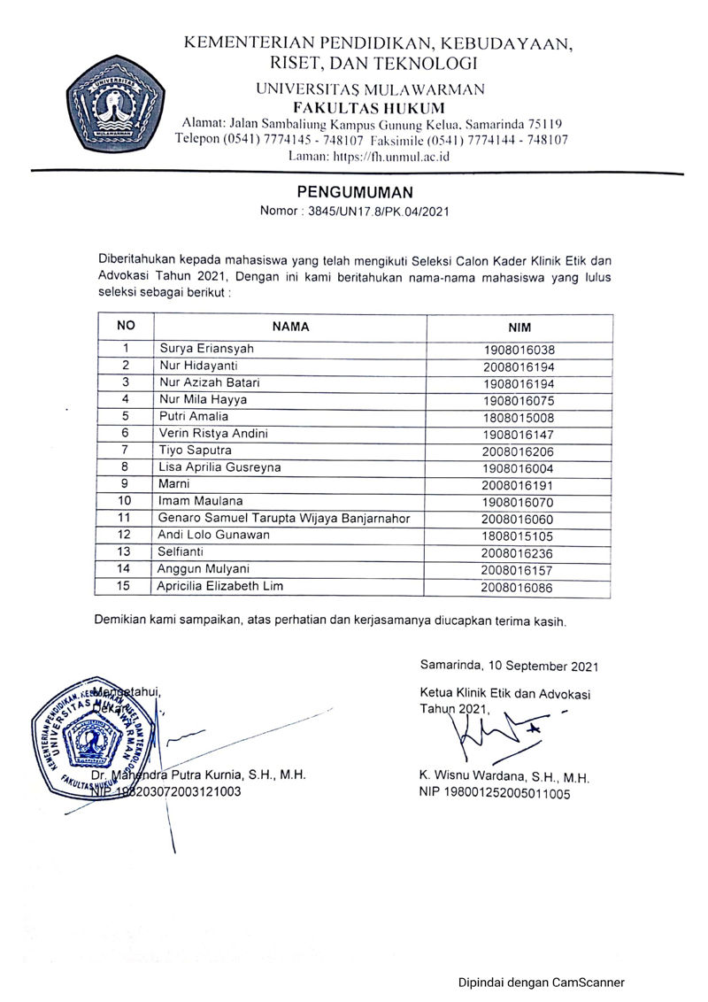 Foto 1: Surat Pengumuman Kelulusan Calon Kader Klinik Etik dan Advokasi Tahun 2021 Fakultas Hukum UNMUL
