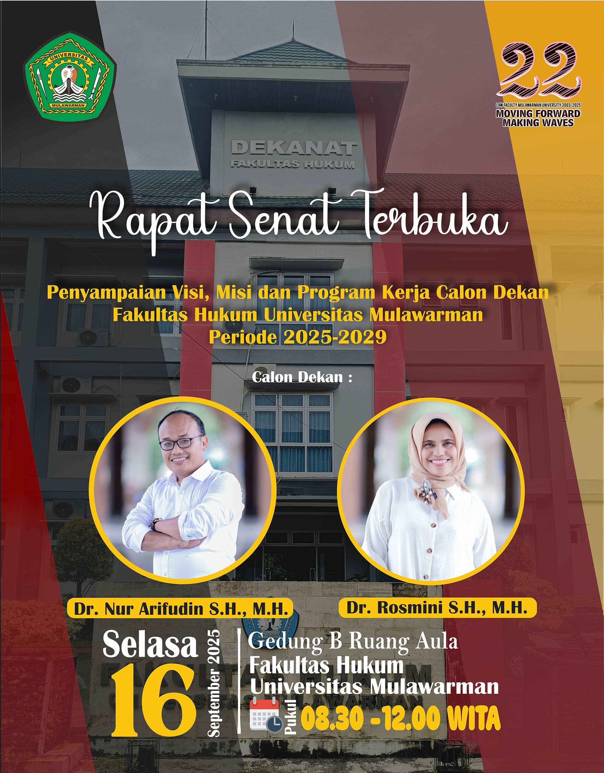 Diselenggarakan hari Selasa, 16 September 2025 pukul 08:30-12:00 WITA bertempat di Ruang Aula - Gedung B Lantai 3 Fakultas Hukum UNMUL.