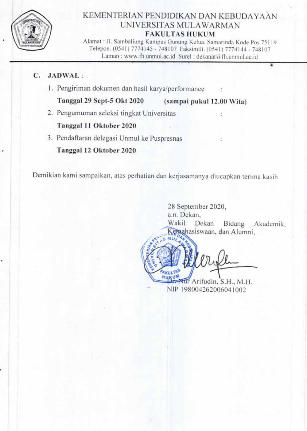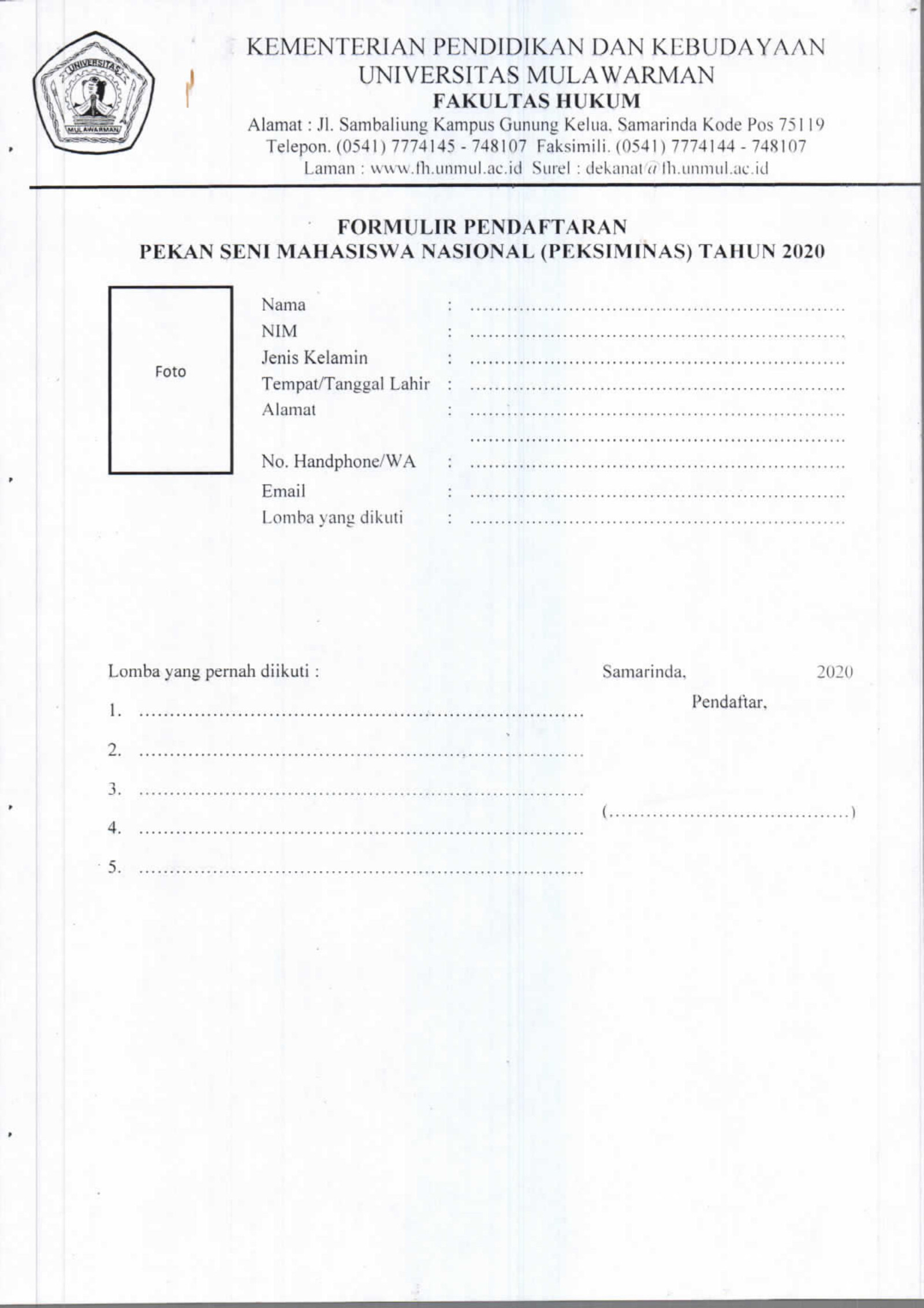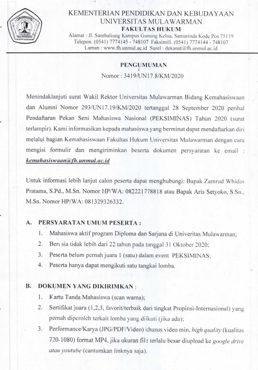 Menindaklanjuti surat Wakil Rektor Universitas Mulawarman Bidang Kemahasiswaan dan Alumni Nomor 293/UN17.19/KM/2020 tertanggal 28 September 2020 perihal pendaftaran Pekan Seni Mahasiswa Nasional (PEKSIMINAS) Tahun 2020 (surat terlampir), Kami informasikan kepada Mahasiswa yang berminat dapat mendaftarkan diri melalui bagian Kemahasiswaan Fakultas Hukum Universitas Mulawarman dengan cara mengisi formulir dan mengirimkan dokumen persyaratan ke email: kemahasiswaan@fh.unmul.ac.id.