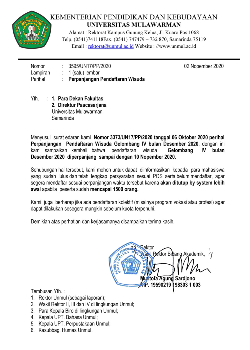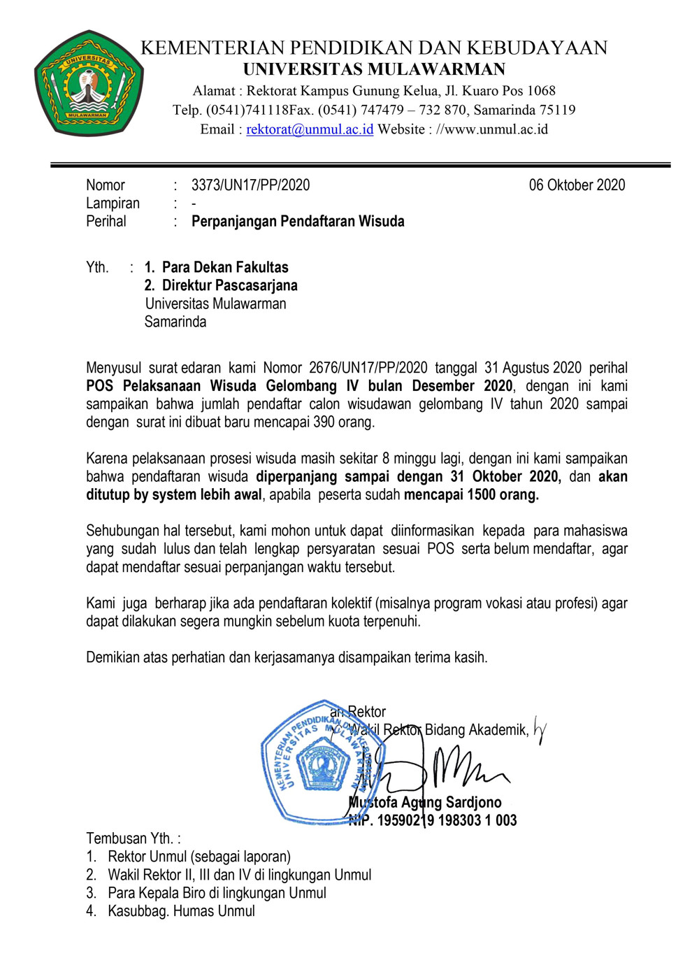 Foto 1: Surat Informasi Perpanjangan Waktu Pendaftaran Wisuda Gelombang 4 Tahun 2020 Unmul (Update)
