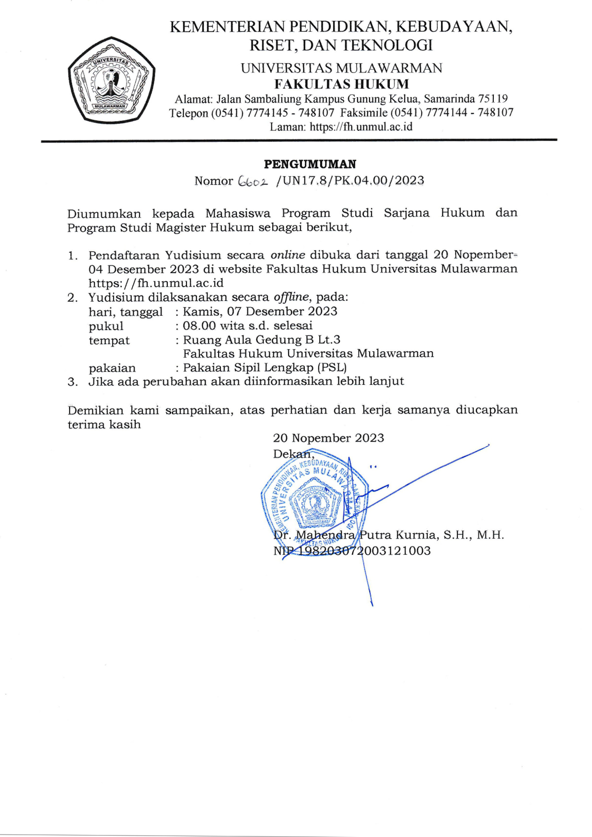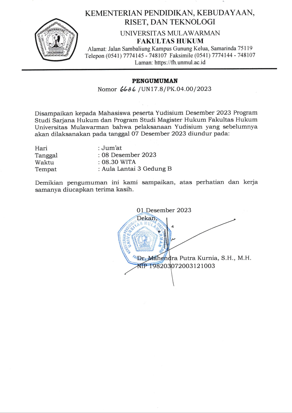 Foto 1: Update - Surat Pengumuman Perihal Perubahan Tanggal Pelaksanaan Yudisium Gelombang 4 Tahun 2023 Fakultas Hukum UNMUL