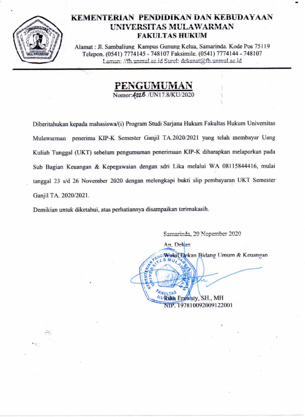 Diberitahukan kepada mahasiswa/(i) Program Studi Sarjana Hukum Fakultas Hukum Universitas Mulawarman penerima KIP-K Semester Ganjil TA 2020/2021 yang telah membayar Uang Kuliah Tunggal (UKT) sebelum penerimaan KIP-K diharapkan dapat melapor ke Subbagian Keuangan dan Kepegawaian Fakultas Hukum UNMUL.