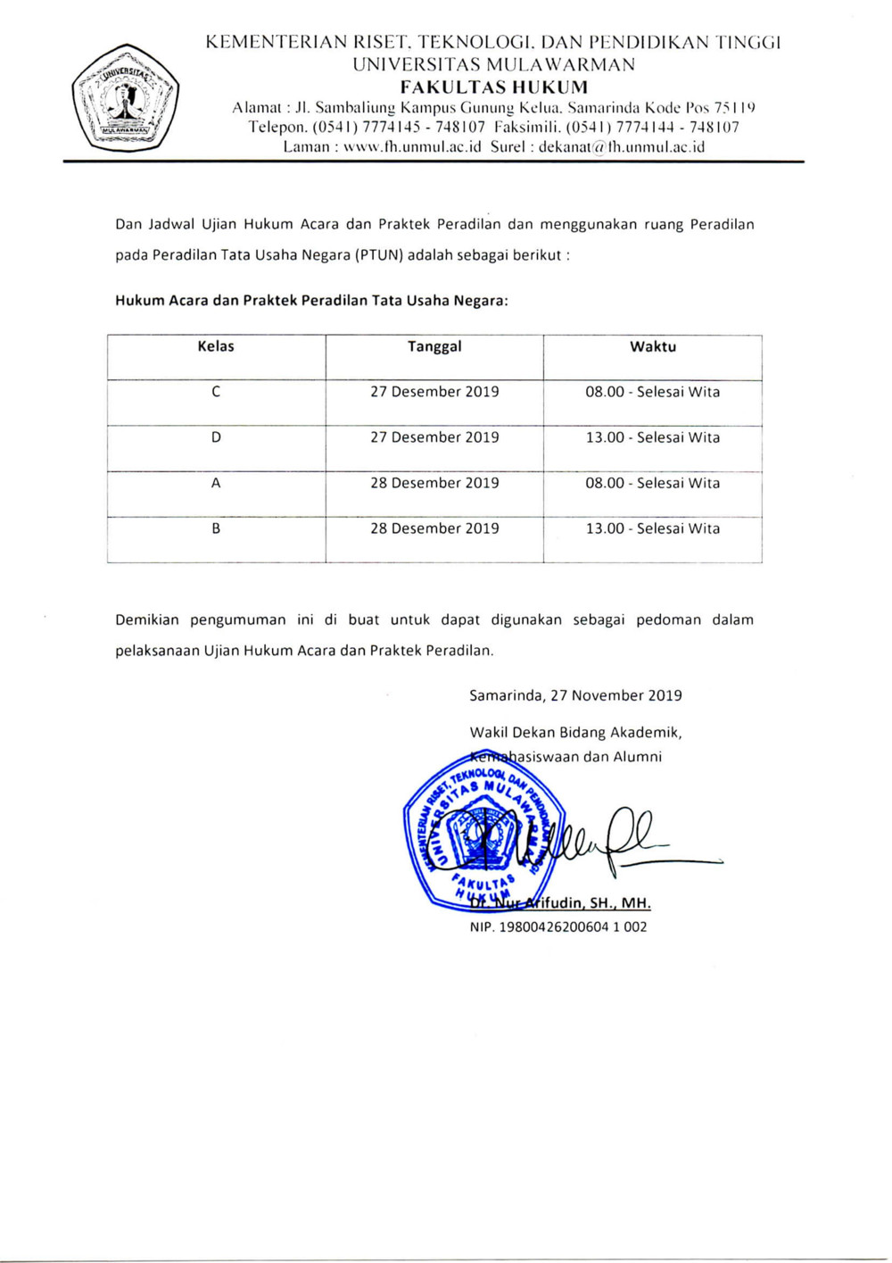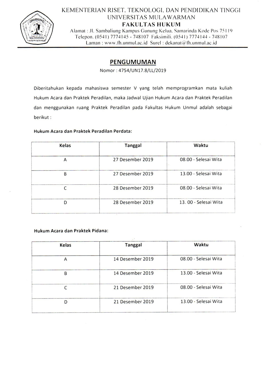Diberitahukan kepada mahasiswa semester V yang telah memprogramkan mata kuliah Hukum Acara dan Praktek Peradilan, maka Jadwal Ujian Hukum Acara dan Praktek Peradilan adalah sebagai berikut. Detail pada surat terlampir.