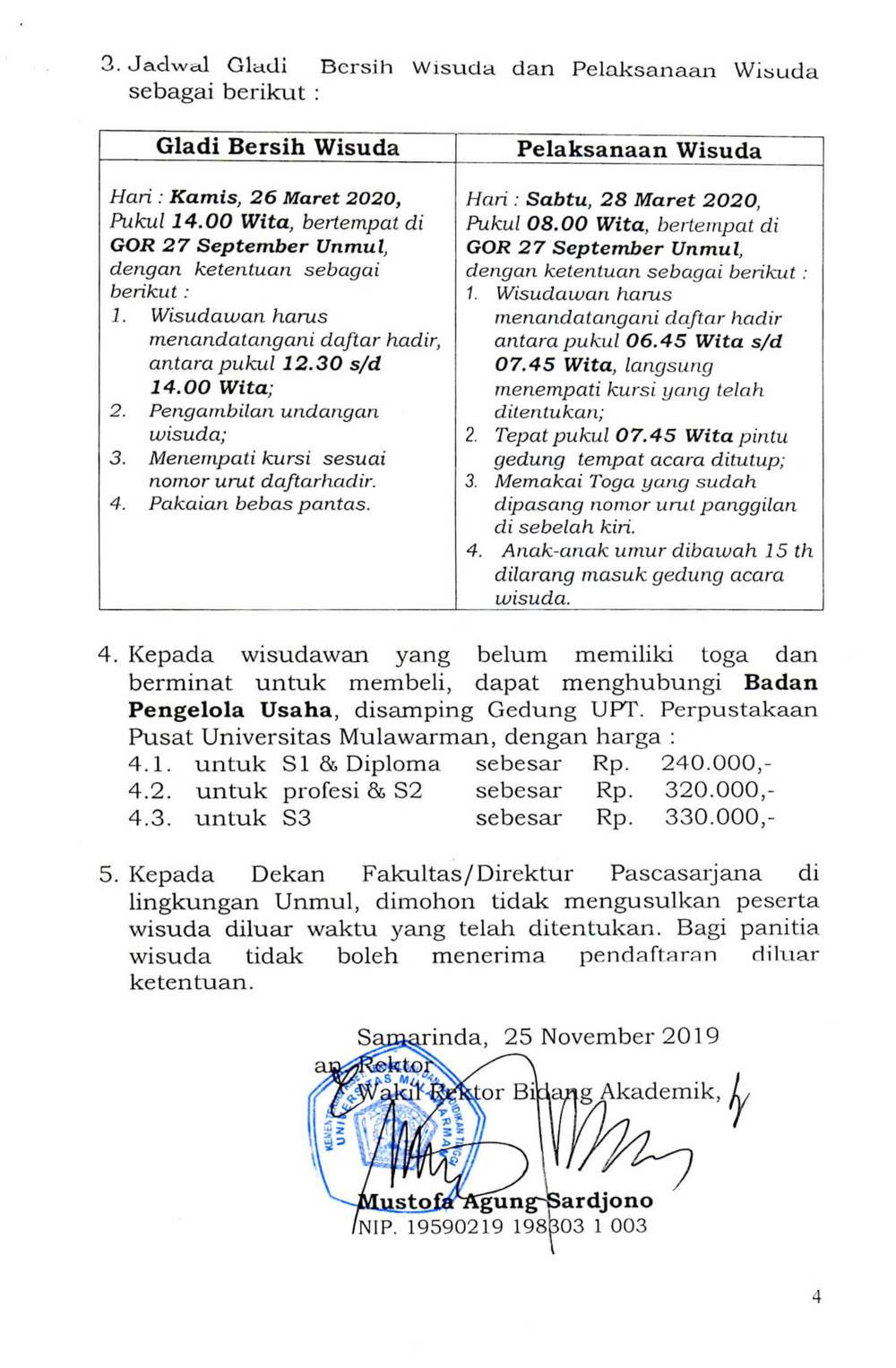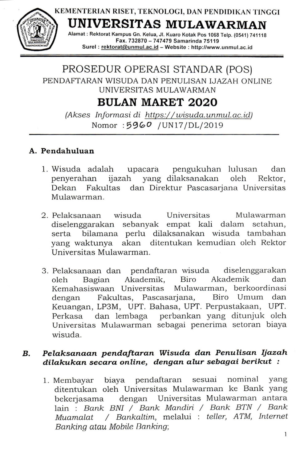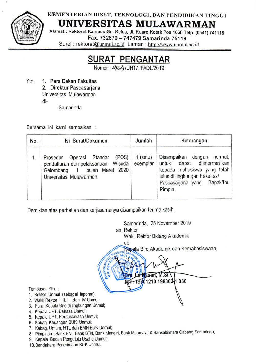 Foto 1: Surat Pengantar Prosedur Operasi Standar (POS) Wisuda dan Penulisan Ijazah Online bulan Maret 2020 Universitas Mulawarman