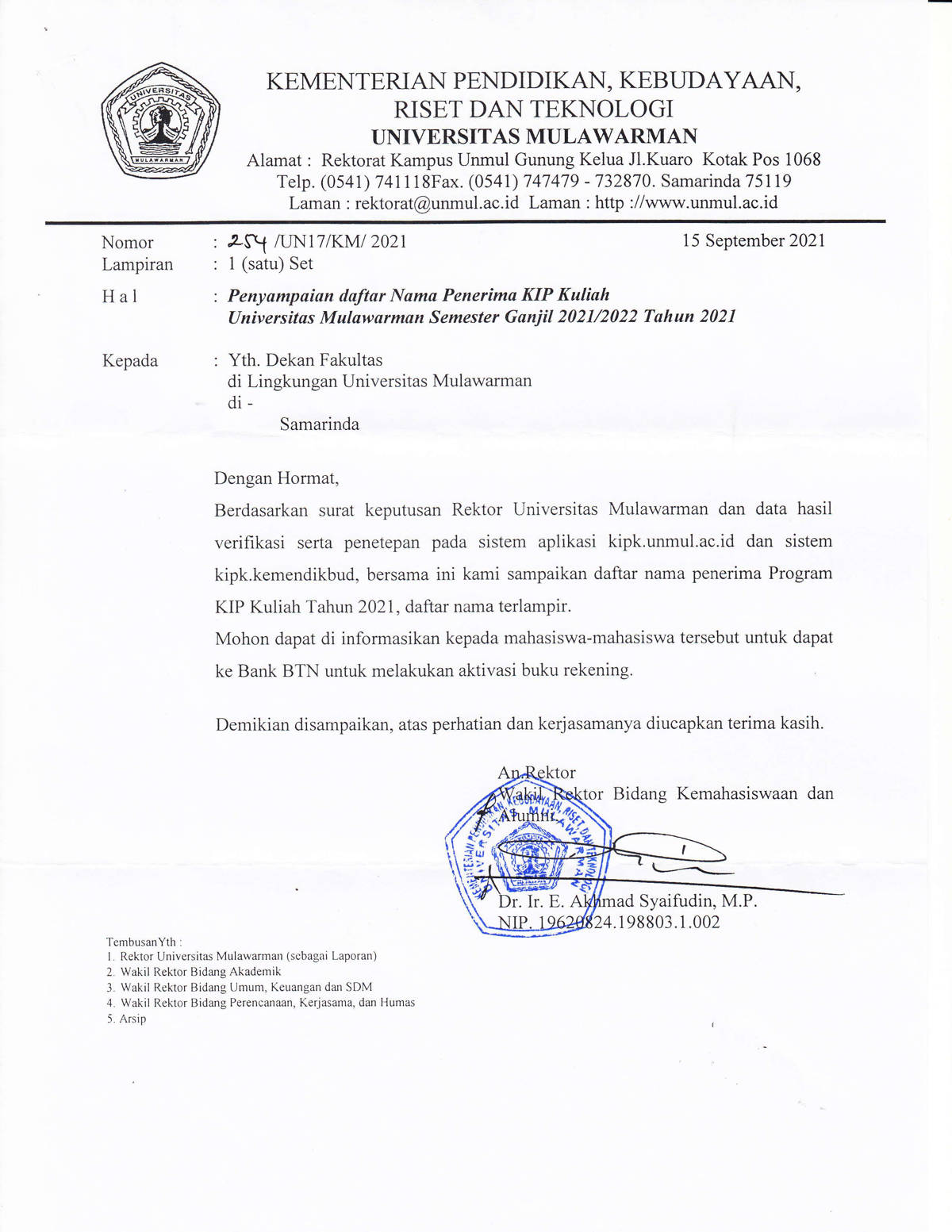 Foto 1: Surat Penyampaian Daftar Nama Mahasiswa Penerima KIP Kuliah Universitas Mulawarman Semester Ganjil 2021/2022 Tahun 2021