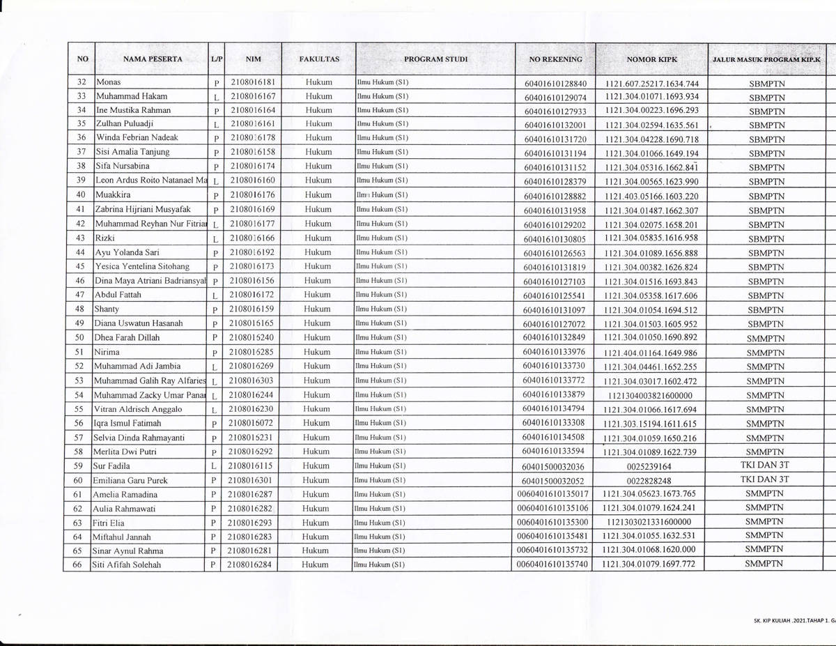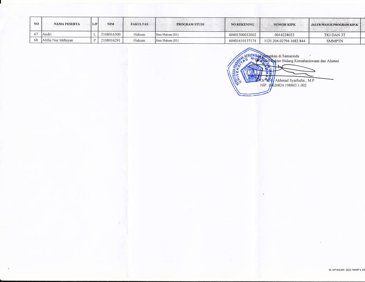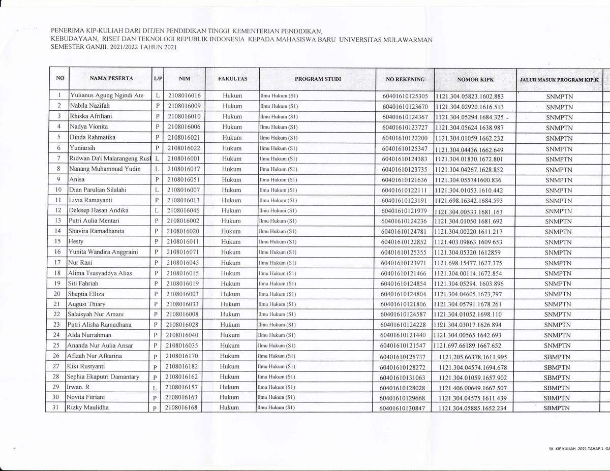 Berdasarkan surat keputusan Rektor Universitas Mulawarman dan data hasil verifikasi serta penetapan pada sistem aplikasi kipk.unmul.ac.id dan sistem kipk.kemendikbud, bersama ini kami sampaikan daftar nama penerima program KIP kuliah Tahun 2021 dari Fakultas Hukum Universitas Mulawarman.