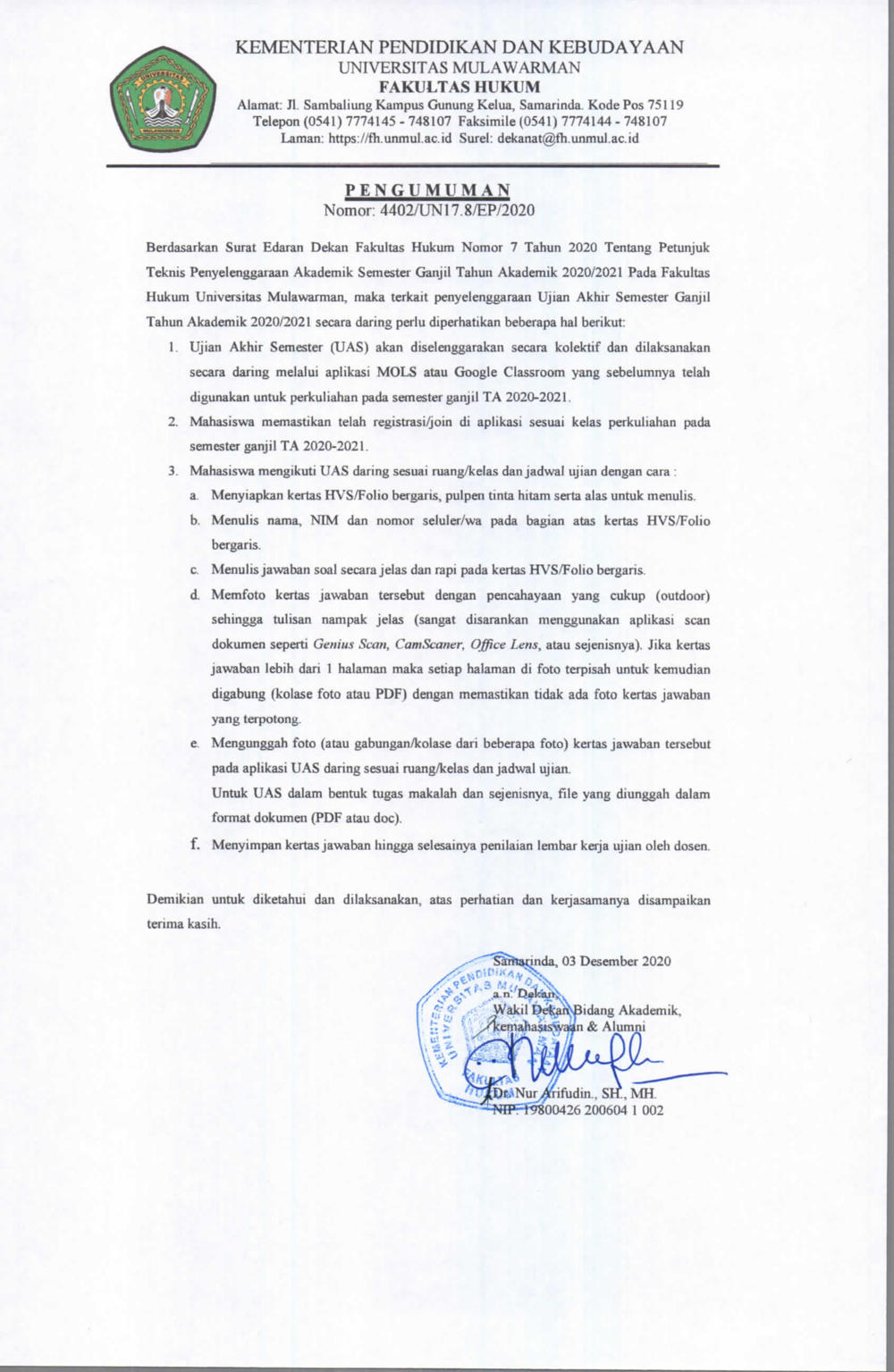 Foto 1: Surat Pengumuman Perihal Penyelenggaraan Ujian Akhir Semester Ganjil TA 2020/2021 FH UNMUL