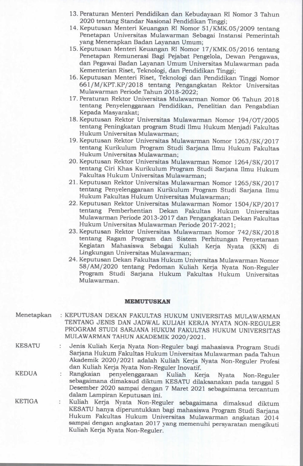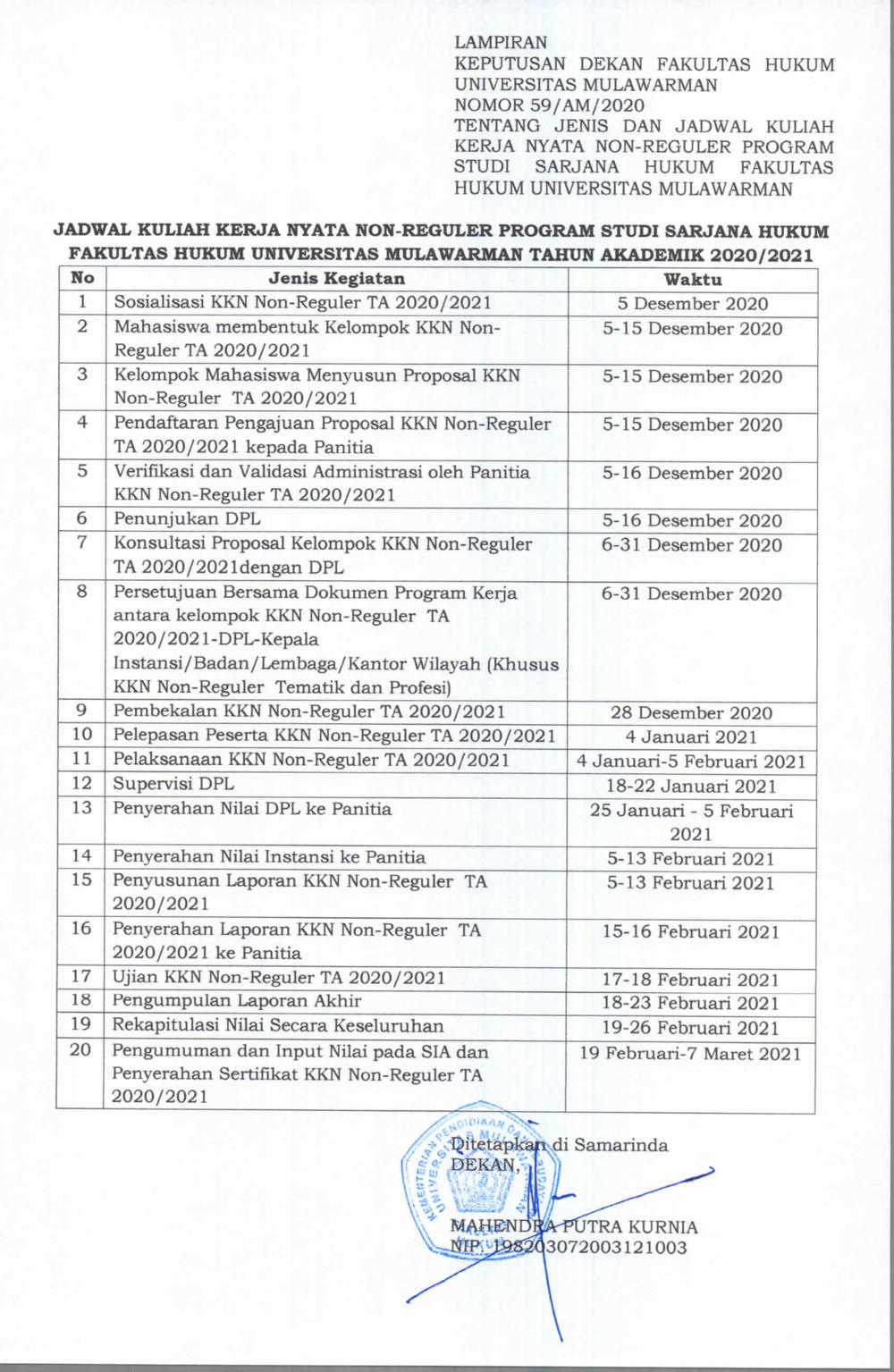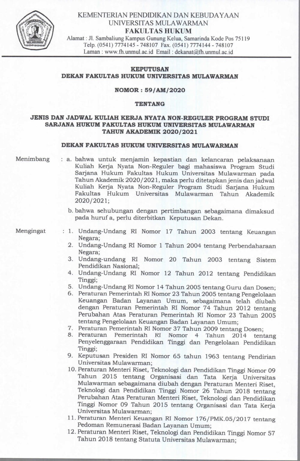 Surat Keputusan Dekan Fakultas Hukum Universitas Mulawarman Nomor: 59/AM/2020 Tentang Jenis dan Jadwal Kuliah Kerja Nyata Non-Reguler Program Studi Sarjana Hukum Fakultas Hukum Universitas Mulawarman Tahun Akademik 2020/2021