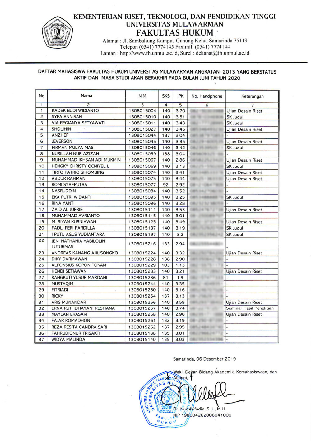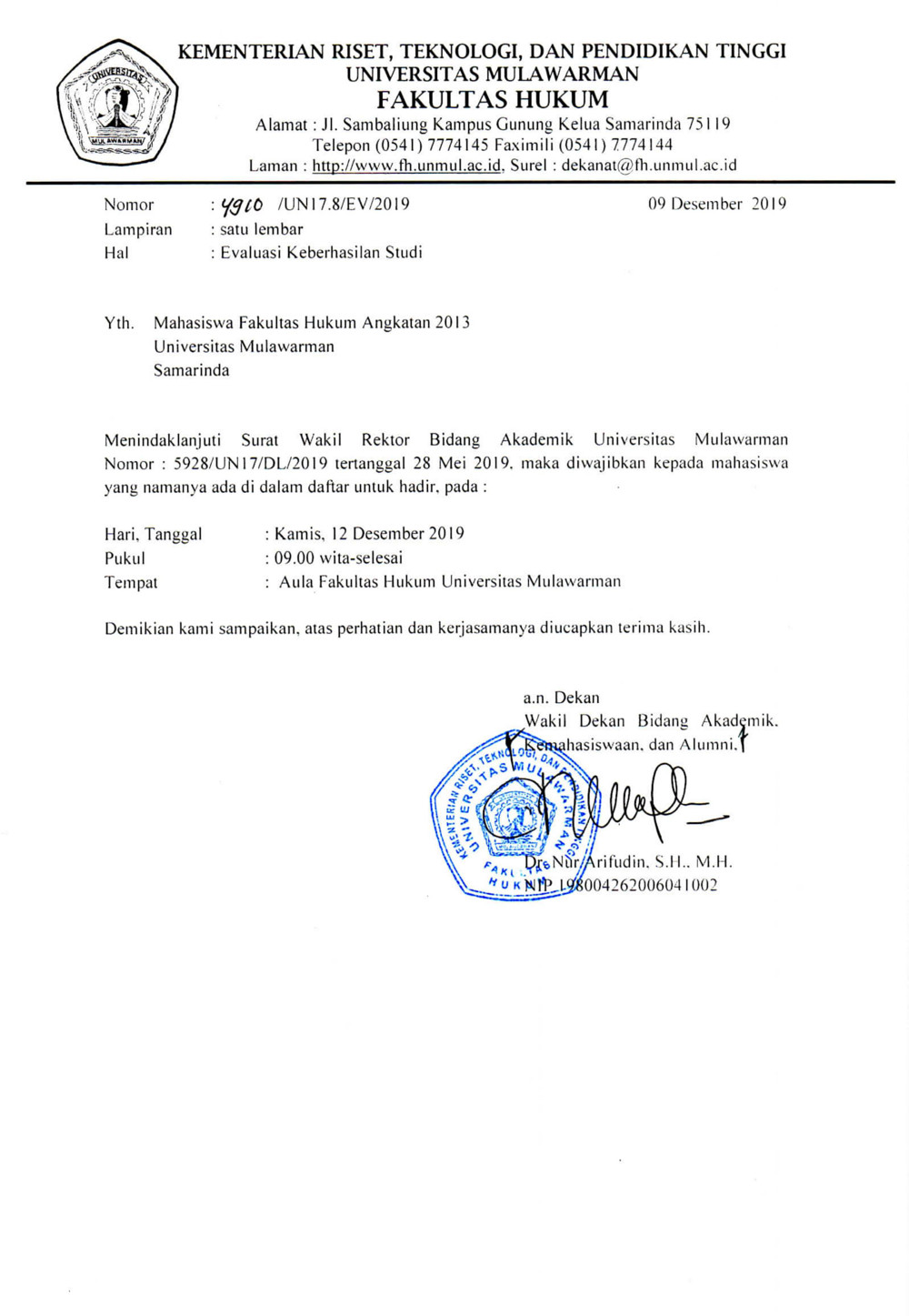 Menindaklanjuti surat Wakil Rektor Bidang Akademik Universitas Mulawarman Nomor: 5928/UN17/DL/2019 tertanggal 28 Mei 2019, maka diwajibkan bagi Mahasiswa program studi Sarjana Ilmu Hukum Angkatan 2013 yang namanya tertera pada daftar terlampir untuk hadir dalam kegiatan Evaluasi Keberhasilan Studi pada hari kamis, 12 Desember 2019 pukul 09.00WITA s/d selesai bertempat di Ruang Aula Fakultas Hukum Universitas Mulawarman. Demikian kami sampaikan, atas perhatian diucapkan terima kasih.