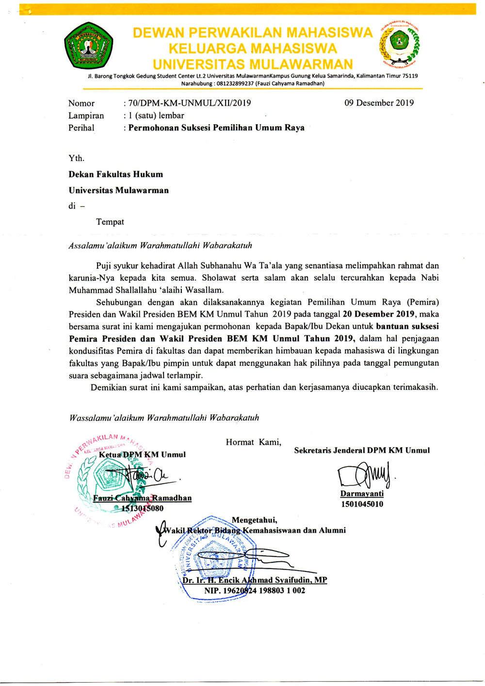 Foto 1: Surat Permohonan Suksesi Pemilihan Unmul Raya 2019 - DPM KM UNMUL