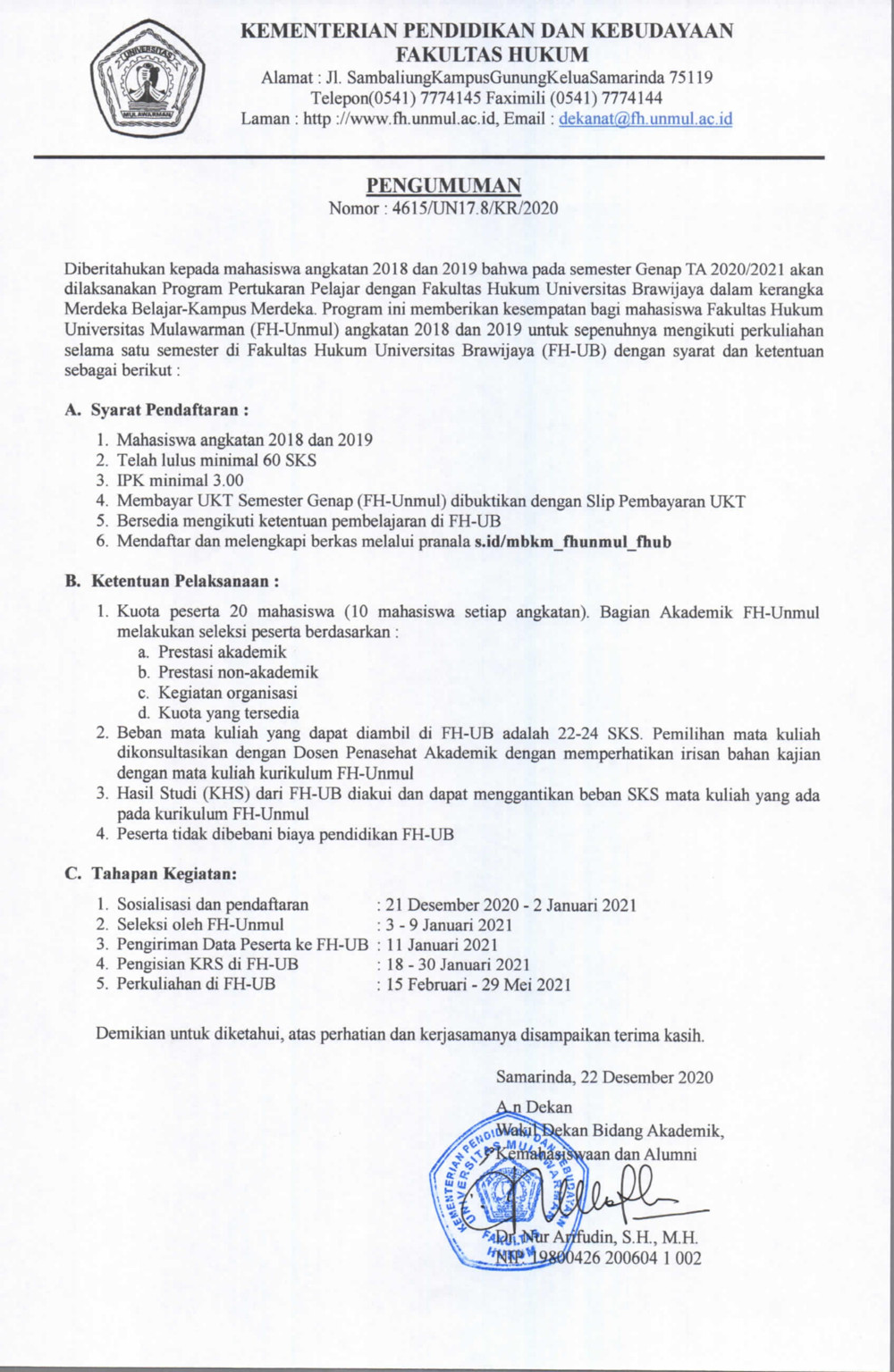 Diberitahukan kepada mahasiswa angkatan 2018 dan 2019 bahwa pada semester Genap TA 2020/2021 akan dilaksanakan Program Pertukaran Pelajar dengan Fakultas Hukum Universitas Brawijaya dalam kerangka Merdeka Belajar-Kampus Merdeka. Program ini memberikan kesempatan bagi mahasiswa Fakultas Hukum Universitas Mulawarman (FH-Unmul) angkatan 2018 dan 2019 untuk sepenuhnya mengikuti perkuliahan selama satu semester di Fakultas Hukum Universitas Brawijaya (FH-UB). Link Pendaftaran: http://s.id/mbkm_fhunmul_fhub