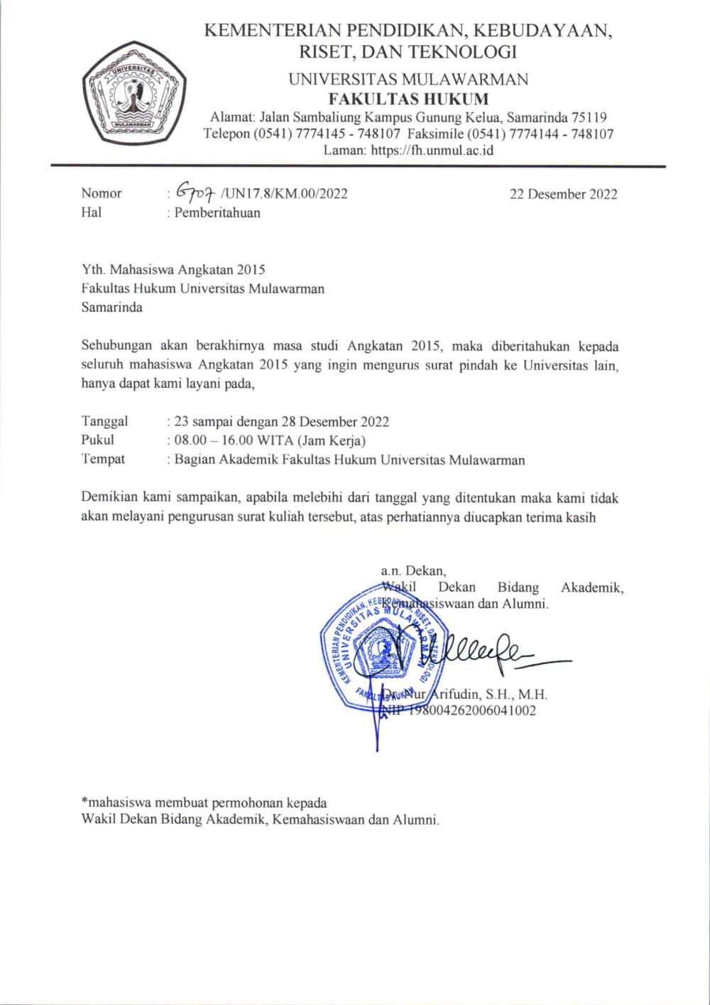 Sehubungan akan berakhirnya masa studi mahasiswa Angkatan 2015, maka diberitahukan kepada seluruh mahasiswa Angkatan 2015 yang ingin mengurus surat pindah ke Universitas lain dapat mengikuti jadwal yang telah ditetapkan oleh fakultas yaitu tanggal 23-28 Desember 2022.