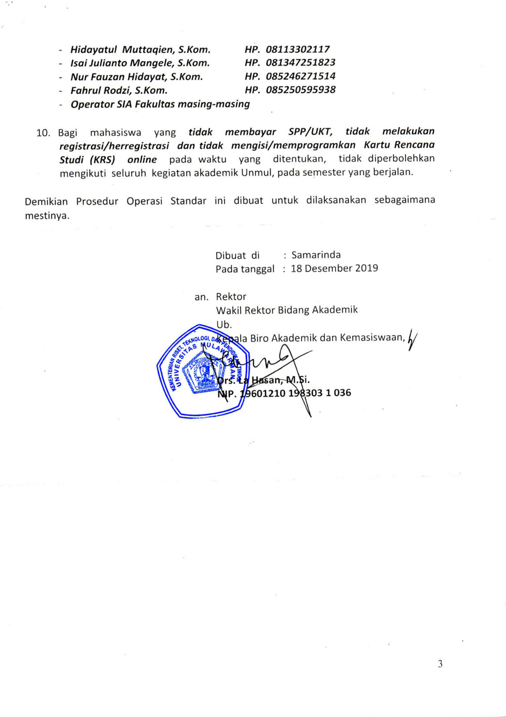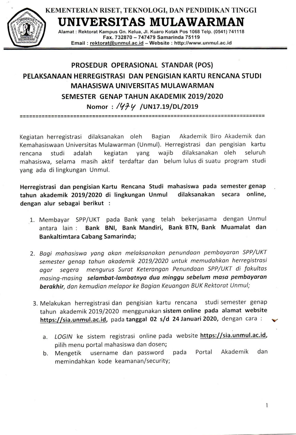 Berikut kami informasikan Prosedur Operasi Standar (POS) herregistrasi dan pengisian Kartu Rencana Studi (KRS) semester genap tahun akademik 2019/2020 Universitas Mulawarman. Kegiatan herregistrasi dilaksanakan oleh Bagian Akademik Biro Akademik dan Kemahasiswaan Universitas Mulawarman (UNMUL). Herregistrasi dan pengisian Kartu Rencana Studi adalah kegiatan yang wajib dilaksanakan oleh seluruh mahasiswa, selama masih aktif terdaftar dan belum lulus di suatu program studi yang ada di lingkungan UNMUL.