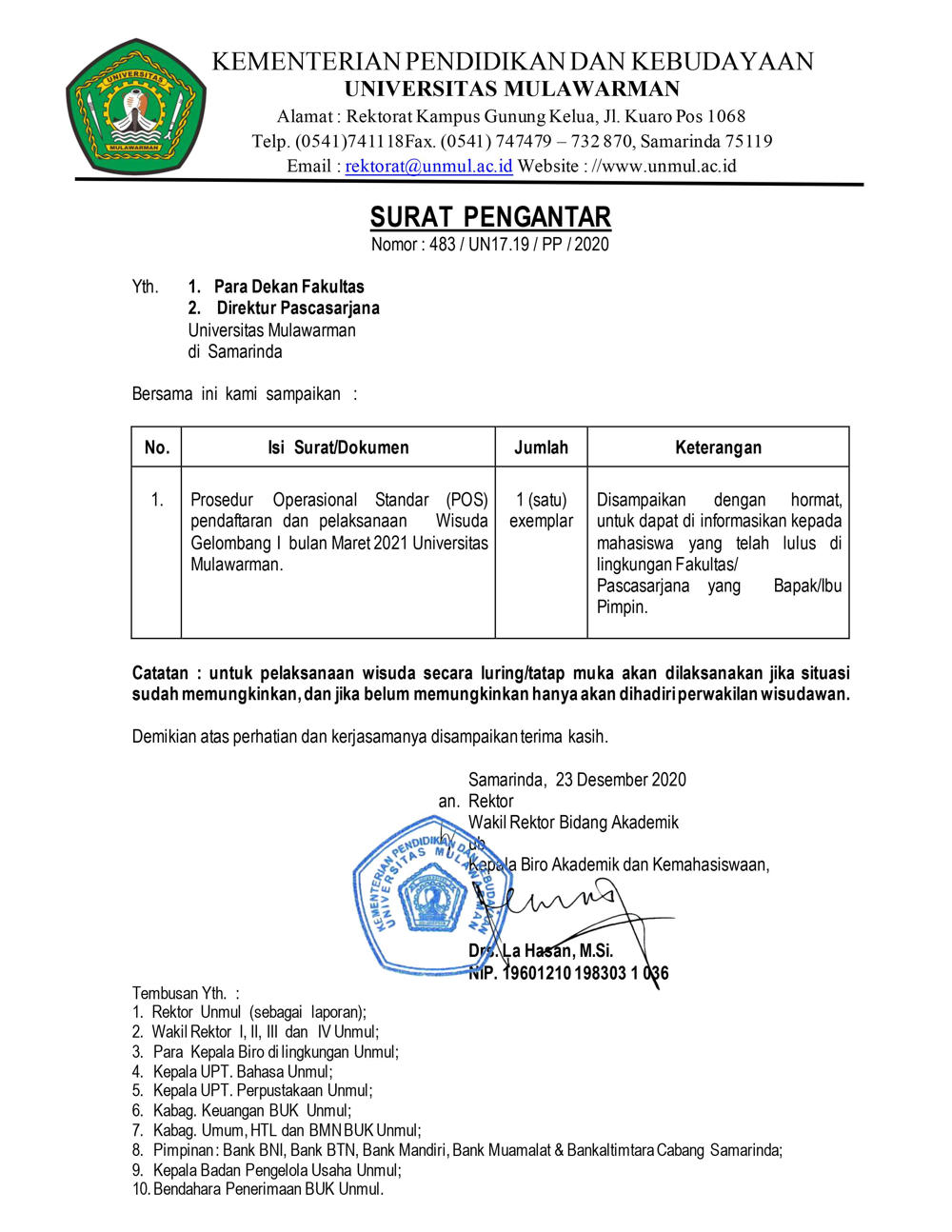 Foto 1: Surat Pengantar Prosedur Operasi Standar (POS) Wisuda dan Penulisan Ijazah Online bulan Maret 2021 Universitas Mulawarman
