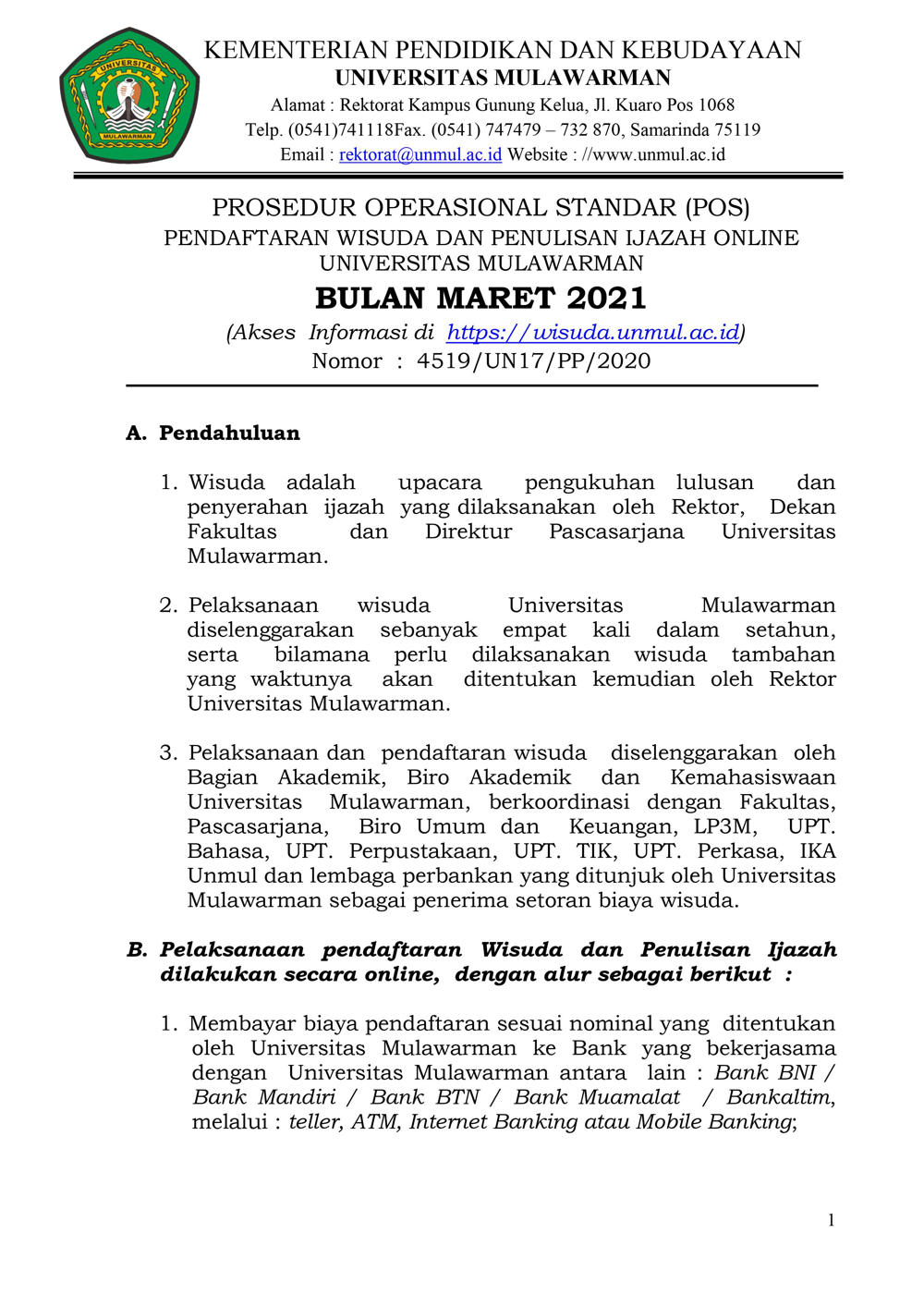 Foto 2: Surat Prosedur Operasi Standar (POS) Wisuda dan Penulisan Ijazah Online bulan Maret 2021 Universitas Mulawarman - Page 1