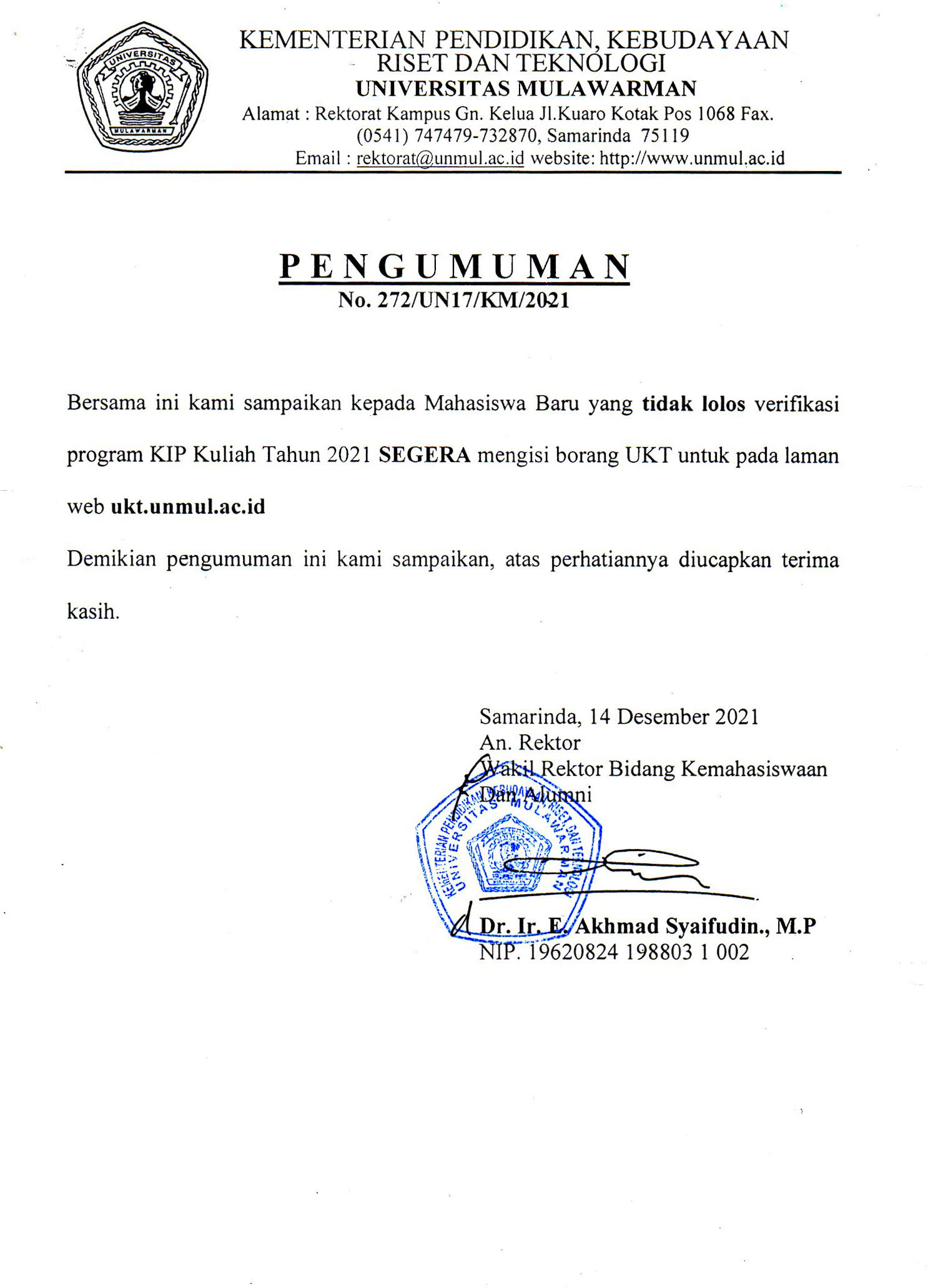 Bersama ini kami sampaikan kepada Mahasiswa Baru yang tidak lolos verifikasi program KIP Kuliah Tahun 2021 SEGERA mengisi borang UKT pada laman web ukt.unmul.ac.id