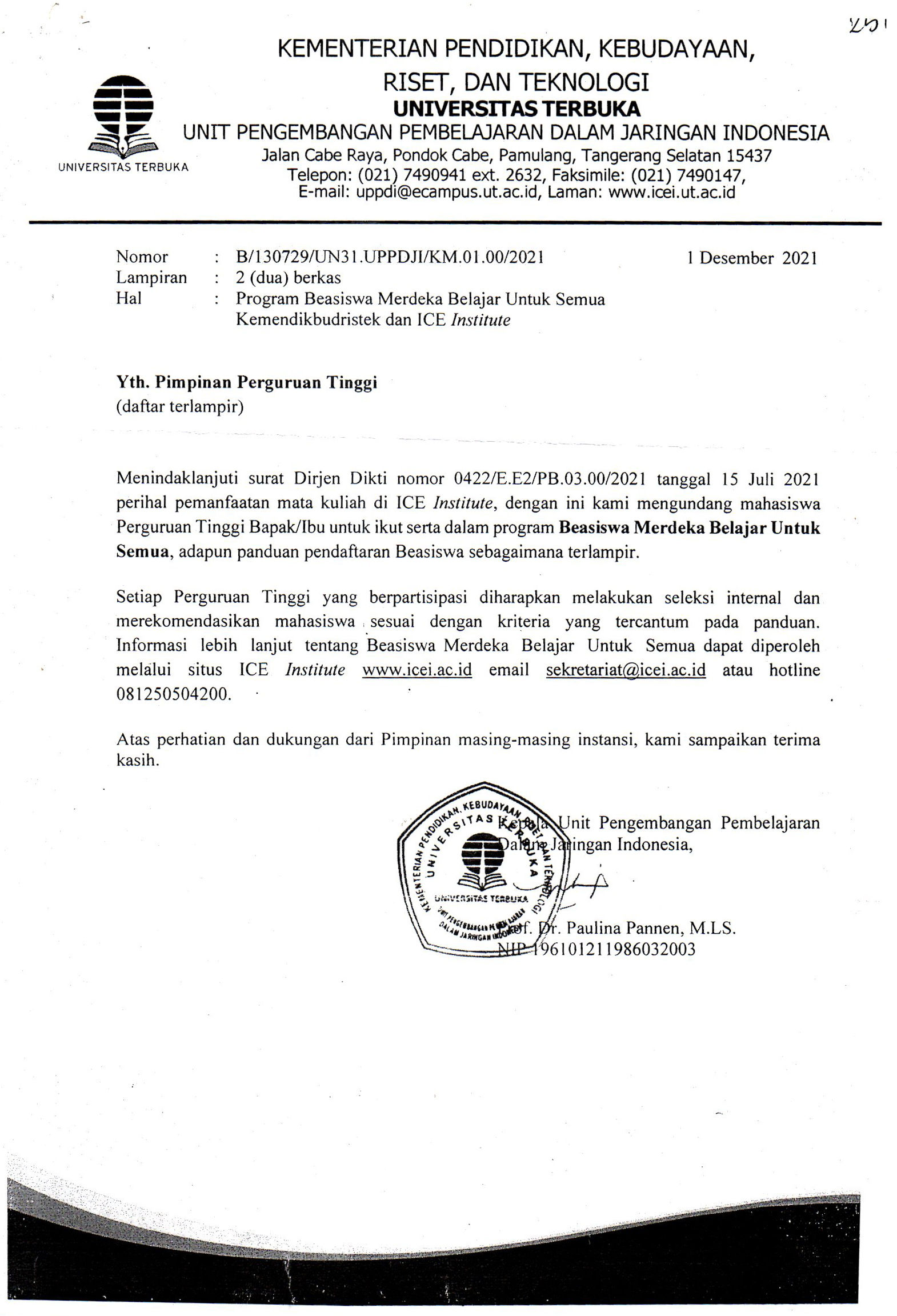 Foto 1: Surat Program Beasiswa Merdeka Belajar Untuk Semua - Kemendikbudristek & ICE Intitute
