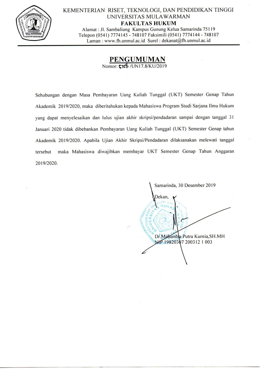 Sehubungan dengan masa pembayaran Uang Kuliah Tunggal (UKT) semester genap tahun akademik 2019/2020, maka diberitahukan kepada Mahasiswa Program Studi Sarjana Ilmu Hukum, Fakultas Hukum Universitas Mulawarman informasi sebagai berikut: