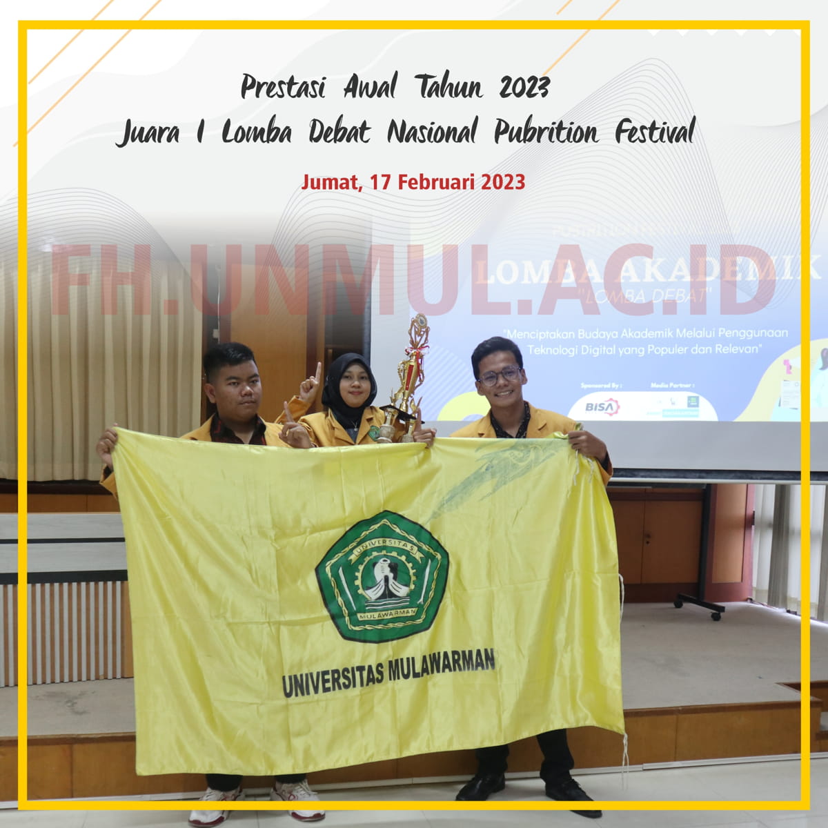 Mengawali Tahun 2023, Mahasiswa Fakultas Hukum Universitas Mulawarman kembali membuat bangga almamater sebagai juara I Tingkat Nasional Debat Nasional Pubrition Festival yang berlangsung di Universitas Ahmad Dahlan Yogyakarta (16-17 Februari 2023). Delegasi Fakultas Hukum terdiri dari Melinda, Rachamd Indrawan Sidiq, dan Muhammad Yuga dengan kompak berhasil mengalahkan peserta lainnya dari berbagai perguruan tinggi.