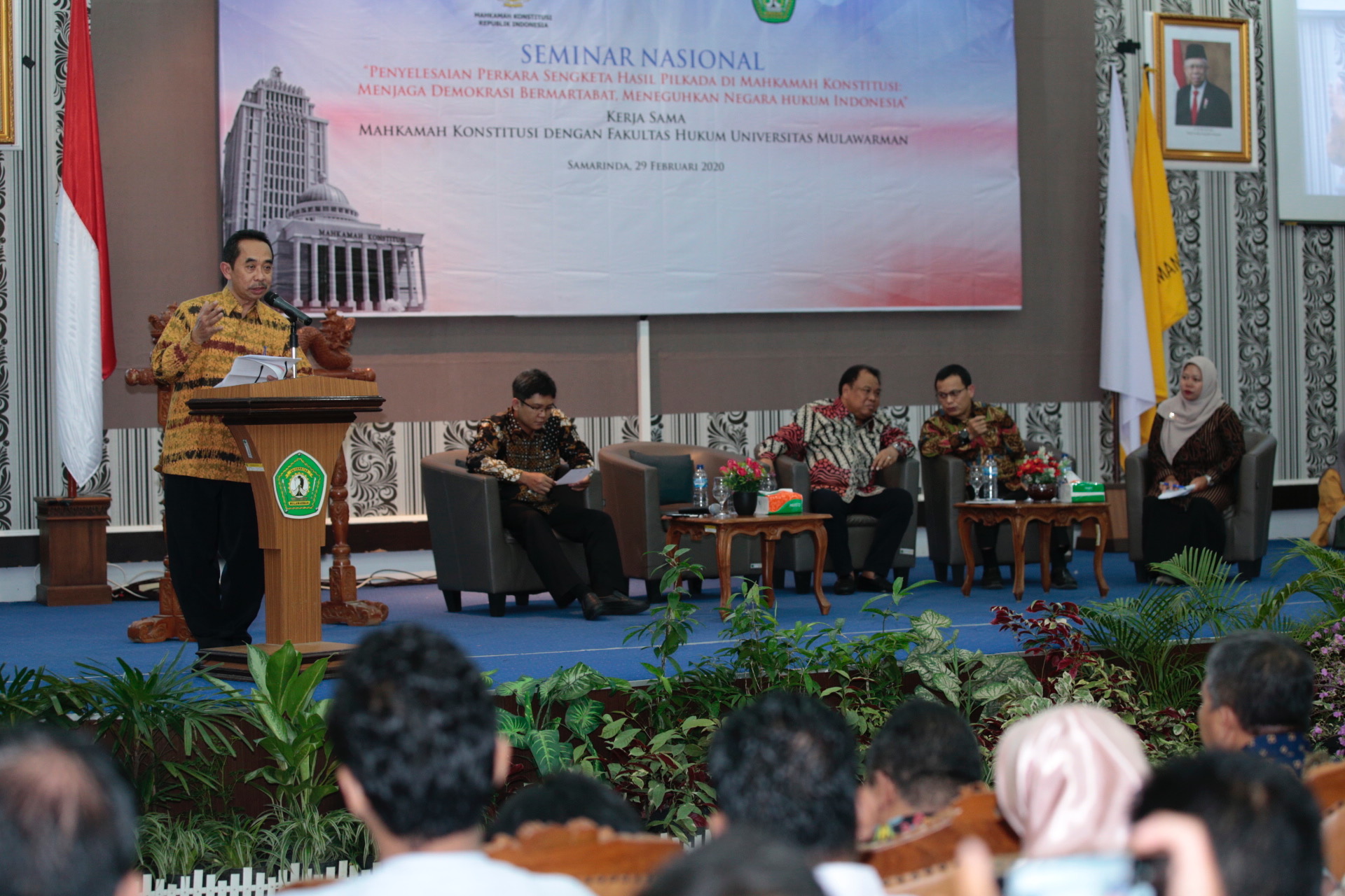 SAMARINDA, HUMAS MKRI - Menjelang pelaksanaan Pemilihan Kepala Daerah 2020, Mahkamah Konstitusi (MK) menyelenggarakan seminar nasional yang bertajuk “Penyelesaian Perkara Sengketa Hasil Pilkada di Mahkamah Konstitusi: Menjaga Demokrasi Bermartabat, Meneguhkan Negara Hukum Indonesia” pada Sabtu, 29 Februari 2020 pagi. Kegiatan yang diikuti oleh 300 peserta yang berasal dari berbagai kalangan tersebut diselenggarakan di Ruang Serbaguna Lantai 4 Rektorat Universitas Mulawarman, Kampus Gunung Kelua, Samarinda, Kalimantan Timur. Dalam seminar ini, Wakil Ketua MK Aswanto hadir memberikan ceramah kunci.