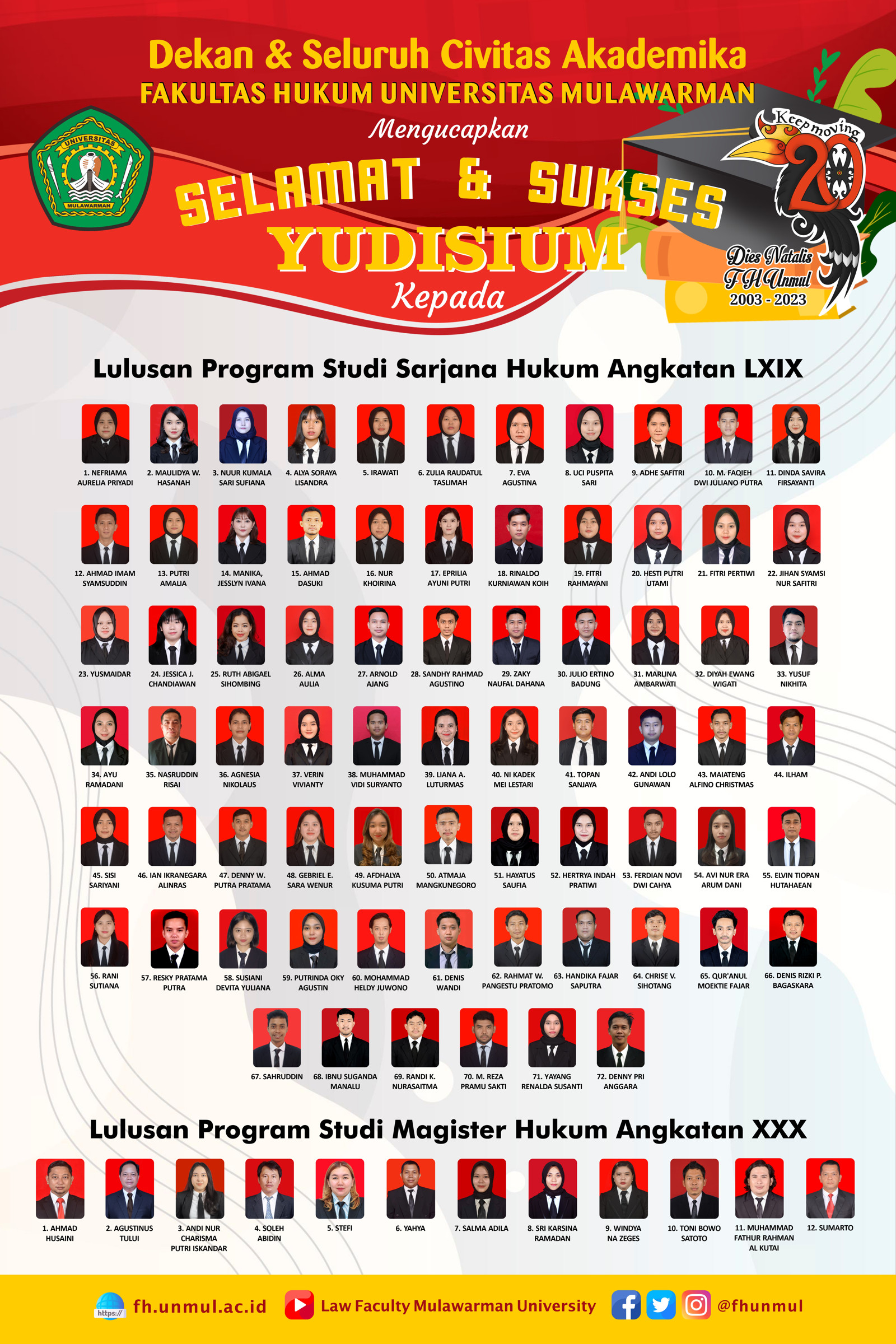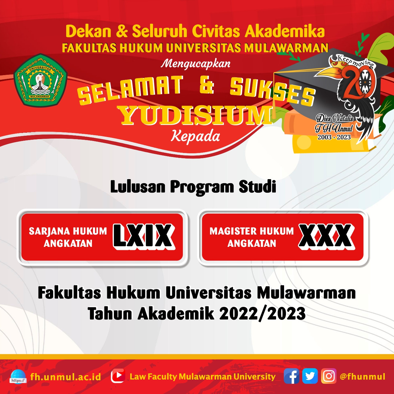 Seluruh Keluarga Besar Fakultas Hukum Universitas Mulawarman mengucapkan Selamat & Sukses Yudisium Lulusan Program Studi Sarjana Hukum Angkatan LXIX (69) dan Program Studi Magister Hukum Angkatan XXX (30) Fakultas Hukum Universitas Mulawarman.