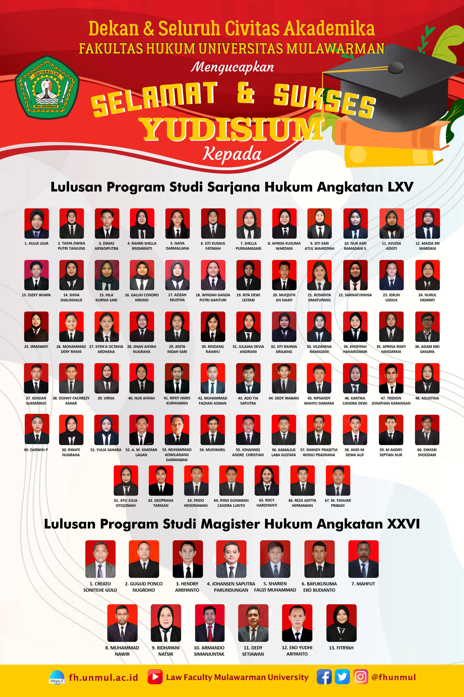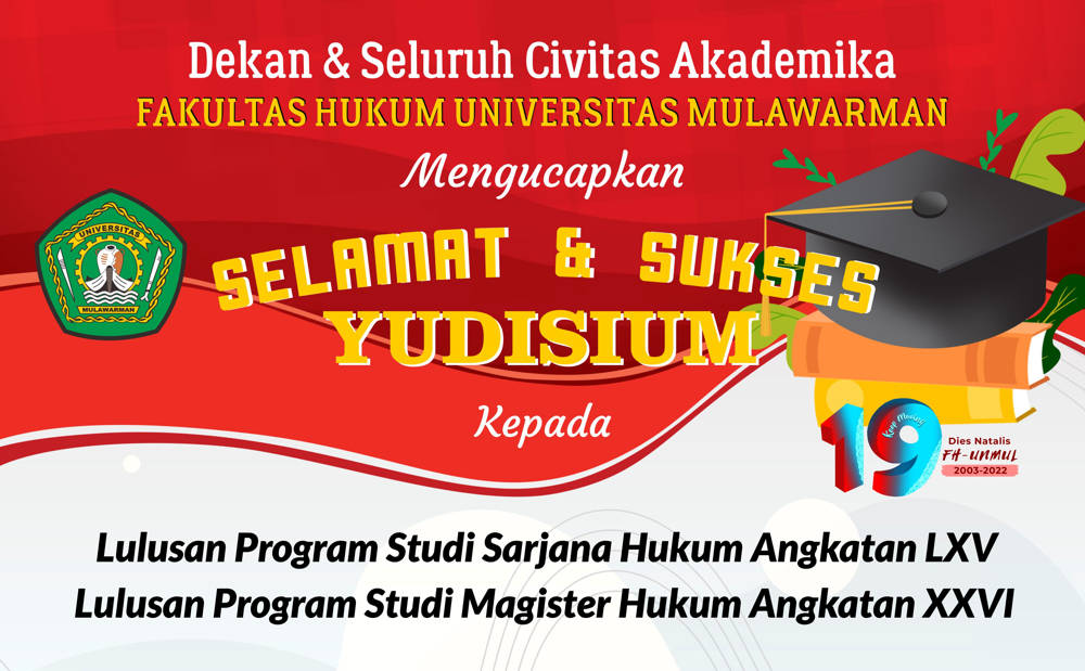 Seluruh Keluarga Besar Fakultas Hukum Universitas Mulawarman mengucapkan Selamat & Sukses Yudisium Lulusan Program Studi Sarjana Hukum Angkatan LXV (65) dan Program Studi Magister Hukum Angkatan XXVI (26) Fakultas Hukum Universitas Mulawarman.