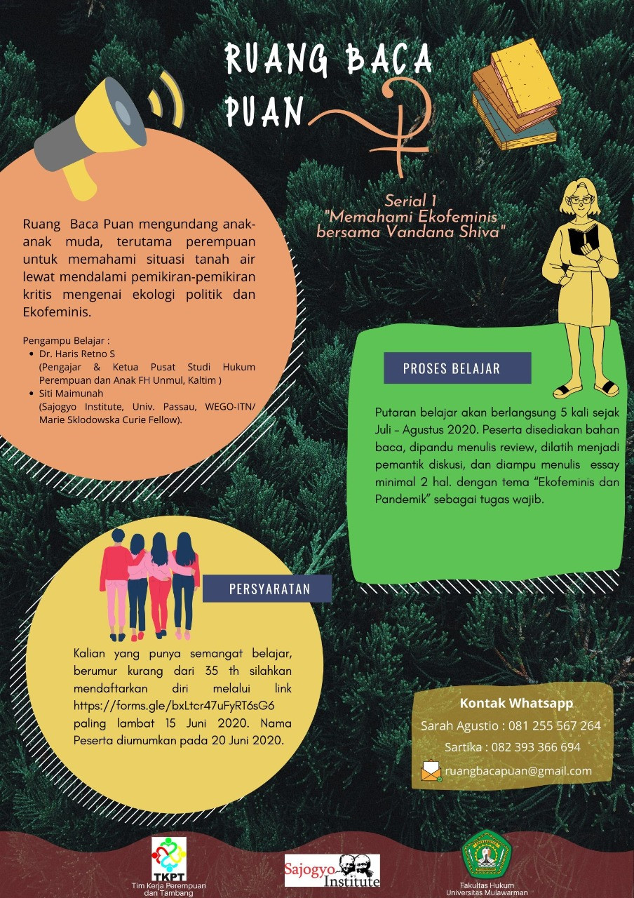 Ruang Baca Puan adalah kelompok baca yang digagas Tim Kerja Perempuan dan Tambang (TKPT) dan Fellow peneliti Sajogyo Institute serta Pusat Studi Hukum Perempuan dan Anak (PuSHPA) Fakultas Hukum Universitas Mulawarman untuk mengajak anak-anak muda, khususnya perempuan memahami situasi tanah air lewat mendalami pemikiran-pemikiran kritis mengenai ekologi politik dan Ekofeminis. Kali ini kita belajar dengan membaca karya-karya pemikir dekolonial dan aktivis perempuan dari India, Vandana Shiva. Proses belajar akan diampu oleh Dr. Haris Retno S (Pengajar & Ketua Pusat studi Hukum Perempuan dan Anak Fakultas Hukum, Universitas Mulawarman) dan Siti Maimunah (Sajogyo Institute; WEGO-ITN/ Marie Slodowska Curie Fellow, Universitas Passau Jerman).