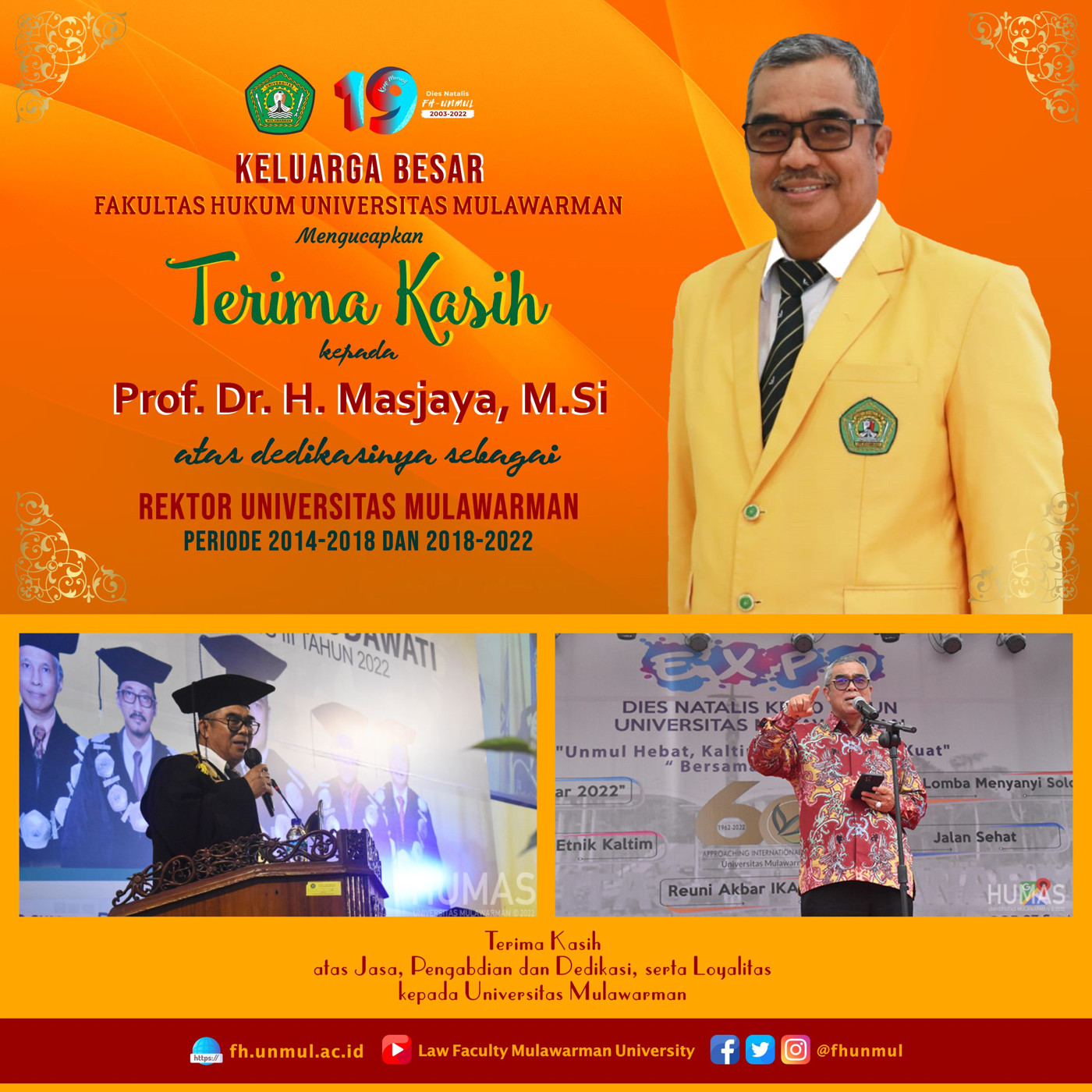 Keluarga Besar Fakultas Hukum Universitas Mulawarman mengucapkan Terima Kasih kepada Prof. Dr. H. Masjaya, M.Si atas Jasa, Pengabdian dan Dedikasi serta Loyalitas sebagai Rektor Universitas Mulawarman Periode 2014-2018 dan 2018-2022.