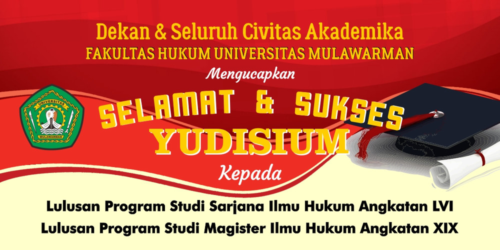 Seluruh Keluarga Besar Fakultas Hukum Universitas Mulawarman mengucapkan Selamat & Sukses Yudisium Lulusan Program Studi Sarjana Ilmu Hukum Angkatan LVI (56) dan Lulusan Program Studi Magister Ilmu Hukum Angkatan XIX (19).