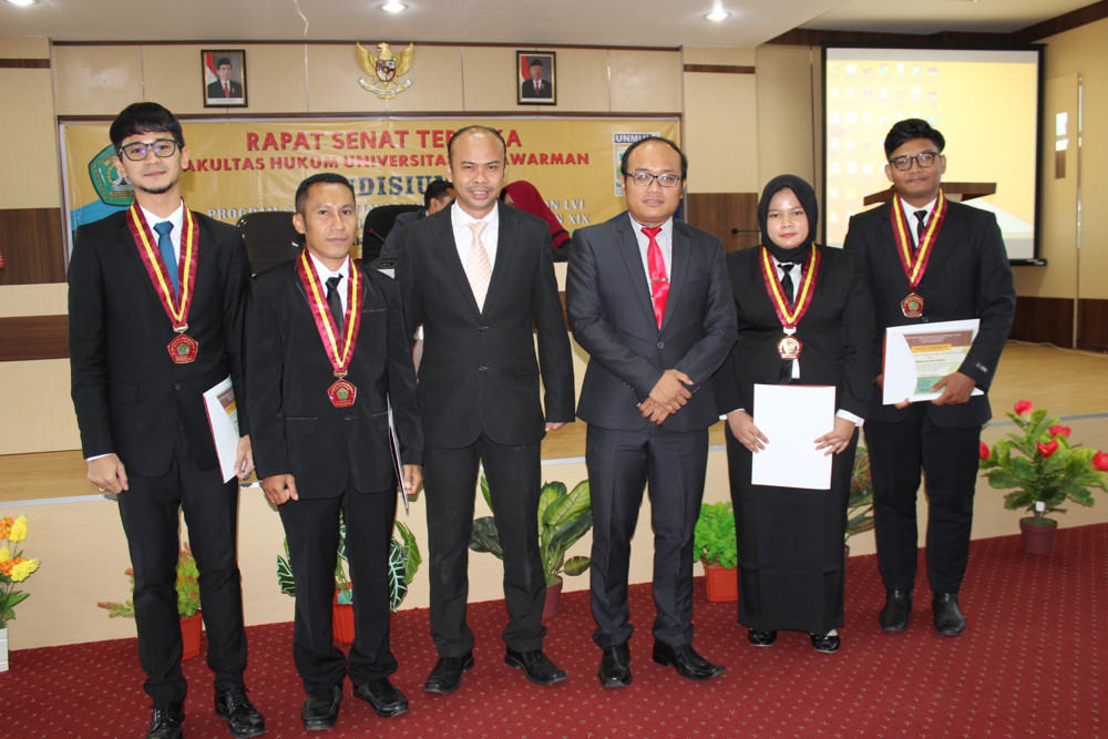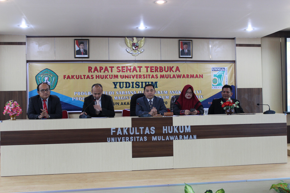 Fakultas Hukum Universitas Mulawarman menyelenggarakan Rapat Senat Terbuka Yudisium Gelombang ke-IV Program Studi Sarjana Ilmu Hukum Angkatan ke-LVI dan Program Studi Magister Ilmu Hukum Angkatan ke-XIX Tahun Akademik 2019/2020, pada hari Kamis, 5 Desember 2019, bertempat di Aula Gedung B lantai 3, sebanyak 24 mahasiswa Program Studi Sarjana Ilmu Hukum dan 6 mahasiswa Program Studi Magister Ilmu Hukum.