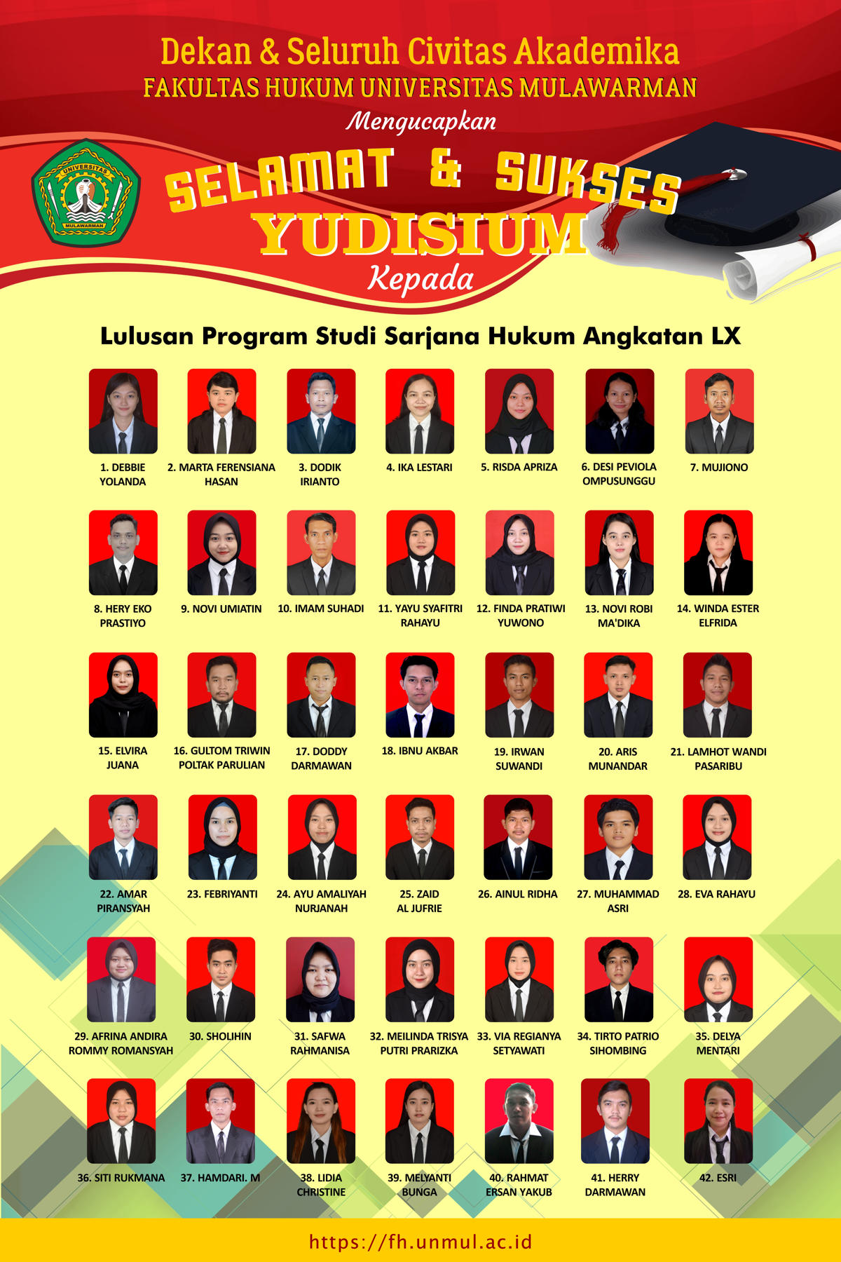Seluruh Keluarga Besar Fakultas Hukum Universitas Mulawarman mengucapkan Selamat & Sukses Yudisium Lulusan Program Studi Sarjana Hukum Angkatan LX (60).