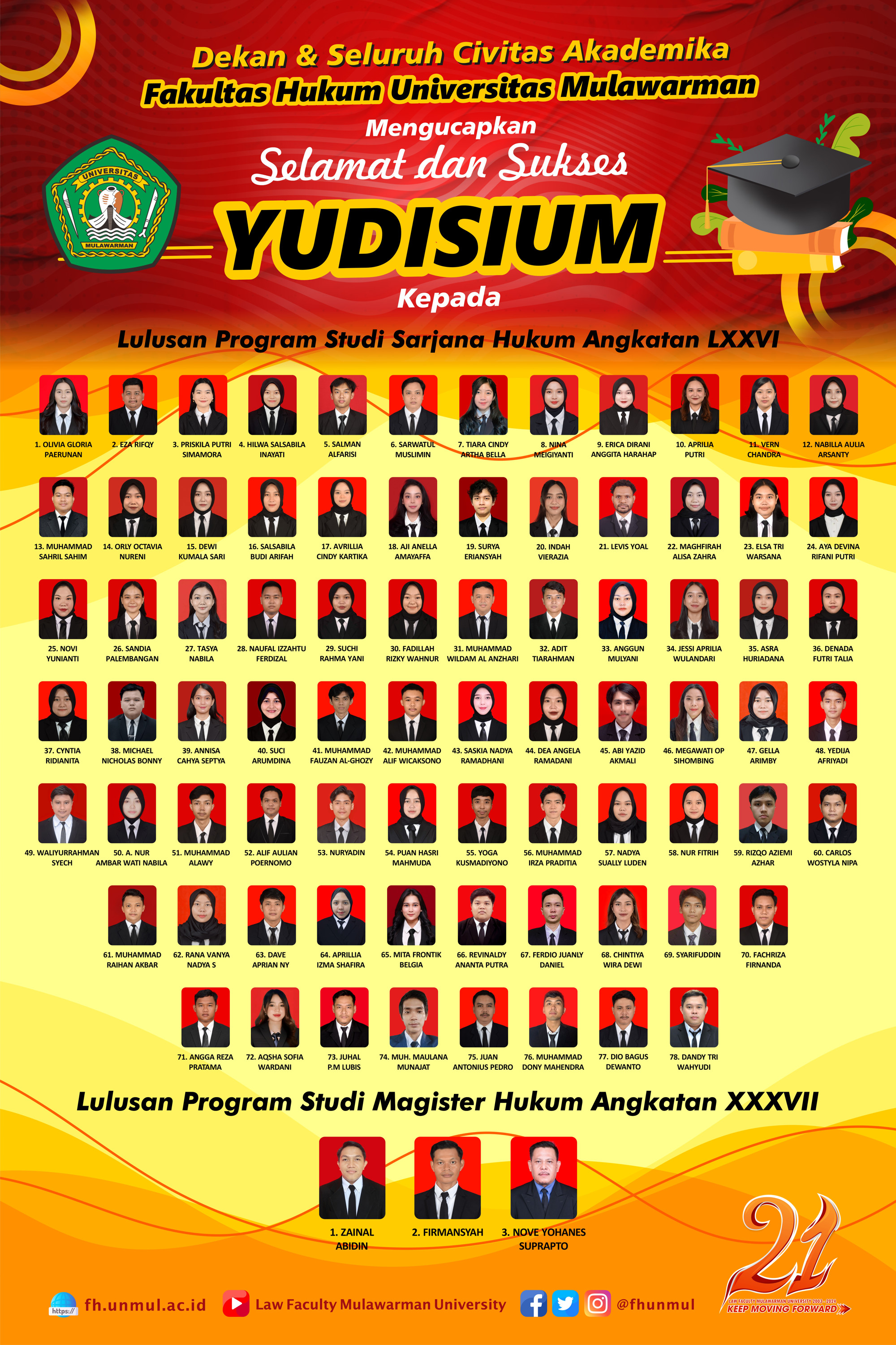 Seluruh Keluarga Besar Fakultas Hukum Universitas Mulawarman mengucapkan Selamat & Sukses Yudisium Lulusan Program Studi Sarjana Hukum Angkatan LXXVI (76) dan Program Studi Magister Hukum Angkatan XXXVII (37) Fakultas Hukum Universitas Mulawarman.