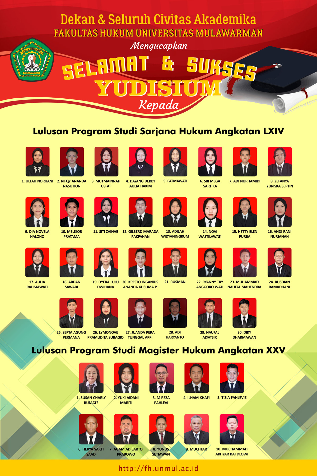 Seluruh Keluarga Besar Fakultas Hukum Universitas Mulawarman mengucapkan Selamat & Sukses Yudisium Lulusan Program Studi Sarjana Hukum Angkatan LXIV (64) dan Program Studi Magister Hukum Angkatan XXV (25) Fakultas Hukum Universitas Mulawarman.